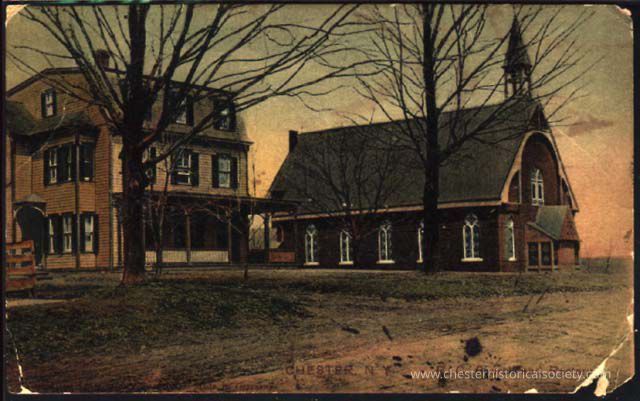 This colorized photo postcard showcases a vintage postcard depicting an early 20th-century scene in Chester, N.Y., featuring the 1887 St. Columba Church and Rectory.Subject Person/Organization