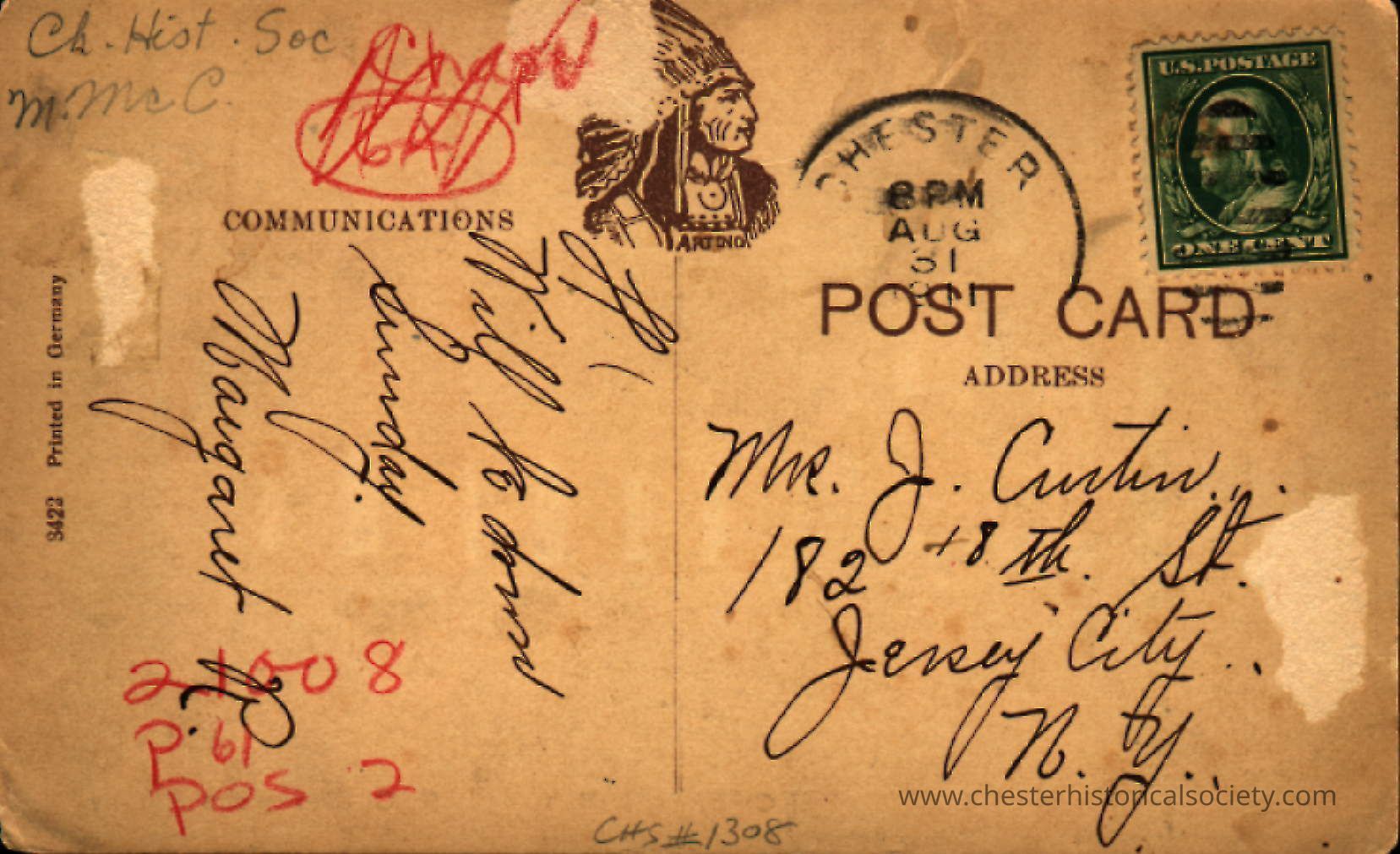 This colorized photo postcard showcases a vintage postcard depicting an early 20th-century scene in Chester, N.Y., featuring the 1887 St. Columba Church and Rectory. This image displays the address side on an old postcard, postmarked from Chester, N. Y. on November 19, 1907. It features a green one-cent Benjamin Franklin stamp in the top right corner. The image shows an old postcard featuring an Artino logo of a Native American wearing a headdress, visible above handwritten scribbles and a green one-cent Benjamin Franklin stamp. The postcard, marked with a cancellation from Chester, N. Y. dated August 31, 8 PM, is addressed to Mrs. J. Curtin of 182 Tenth St., Jersey City, NJ. The card is significantly worn and stained, with various markings and texts, including references to "Communications" and notations in red for the 1992 Village of Chester Centennial book.Subject Person/Organization