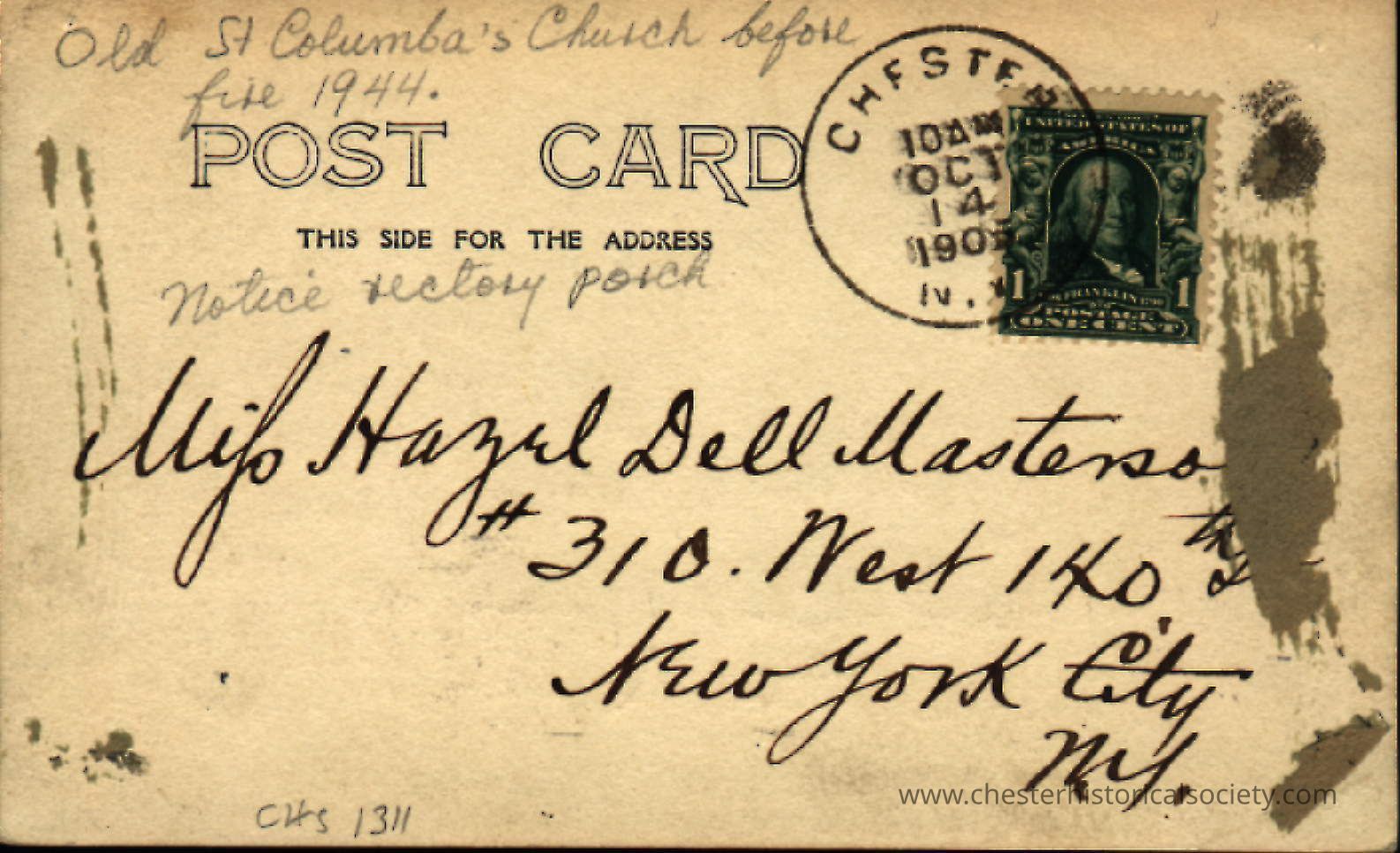 This monochrome photo postcard depicts the first St. Columba's Church built in 1887 nestled among lush trees, with overhanging branches slightly obscuring its architectural details. Two people are faintly visible, sitting on what appears to be the front porch of a nearby house. The photograph, filled with a handwritten message around the edges, a personal to Hazel Dell Masterson from her 'Pop.' The address side features handwritten notes and a one-cent stamp with Benjamin Franklin's image. The postmark indicates "Oct 14 1905." Notably, the text refers to "Old St Columba's Church before the fire 1944," indicating it was written with retrospective mention of an event. The address written reads "Miss Hazel Dell Masterson, #310 West 140th St, New York City, NY."Subject Person/Organization