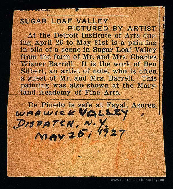 At the Detroit Institute of Arts during April 26 to May 31st is a painting in oils of a scene in Sugar Loaf Valley from the farm of Mr. and Mrs. Charles Wisner Barrell. It is the work of Ben Silbert, an artist of note, who is often a guest of Mr. and Mrs. Barrell. This painting was also shown at the Maryland Academy of Fine Arts.