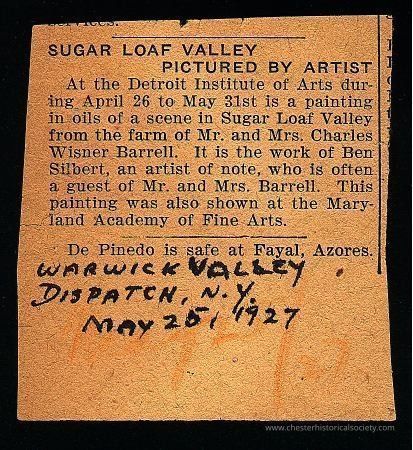 A newspaper clipping titled "Sugar Loaf Valley Pictured by Artist," detailing the exhibition of an oil painting at the Detroit Institute of Arts from April 26 to May 31, featuring a scene from Sugar Loaf Valley on the farm of Mr. and Mrs. Charles Wisner Barrell, painted by the noted artist Ben Silbert. Additionally, the painting was showcased at the Maryland Academy of Fine Arts. The article also mentions aviator De Pinedo's safe arrival at Fayal, Azores.Category
