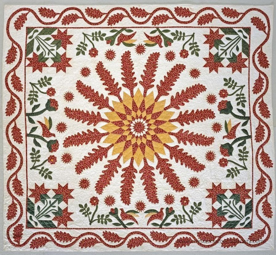 The fabrics used are roller- and discharge-printed cottons. The quilt has a filling of cotton with a white cotton lining. All the pieced and appliquéd motifs have double-outline quilting and the open spaces are filled with motifs of flowers, running vines, leaves, sprigs, fleur-de-lis, botehs, and hearts; each quilted 8 stitches to the inch. This quilt’s dramatic design incorporates a popular mid-19th century motif: plumes or the “Princess Feather” pattern, in the then-fashionable red and green color combination.
