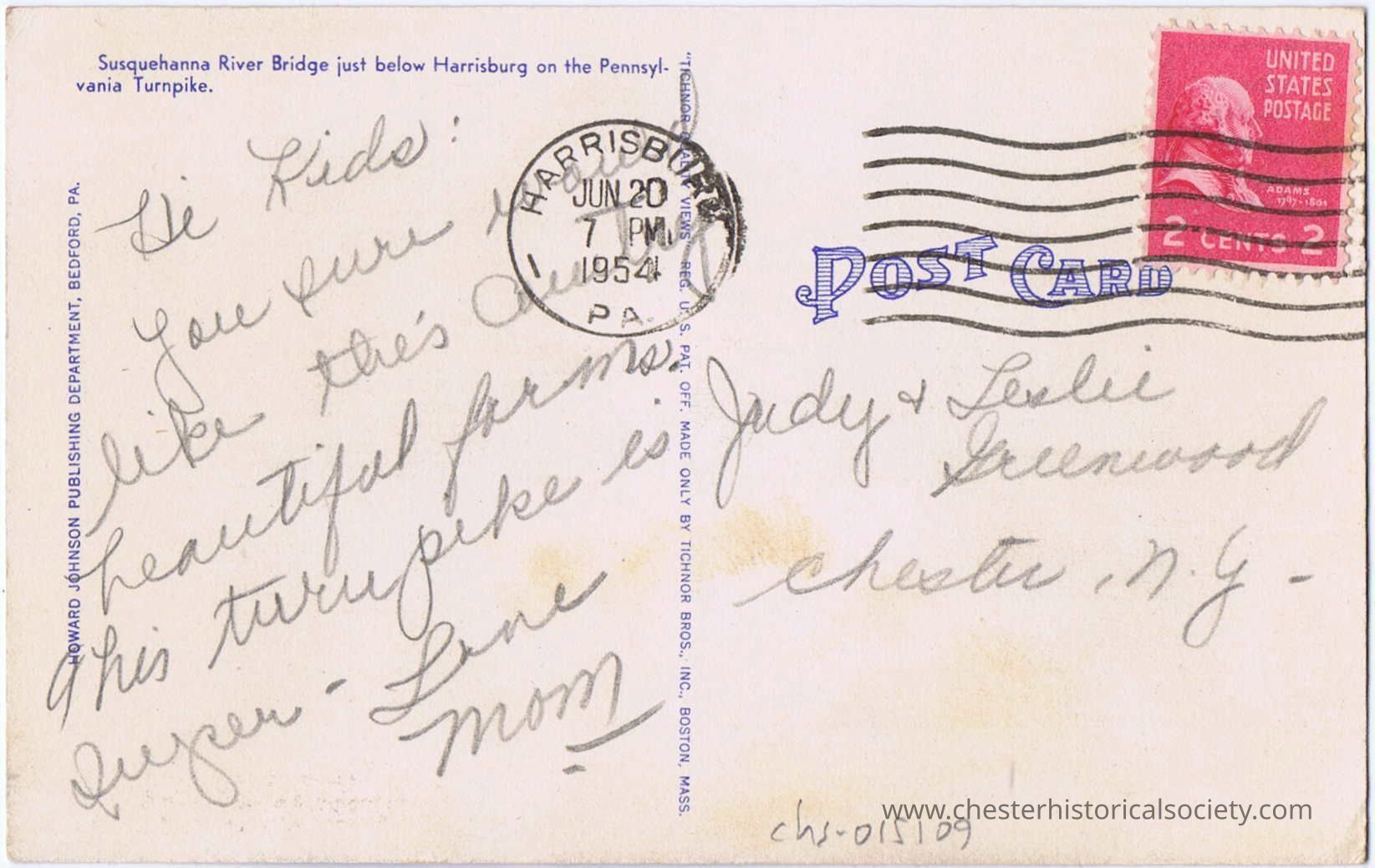 The image displays the back of an old postcard, featuring handwritten correspondence, a postal cancellation from Harrisburg, PA dated June 20, 1954, and a red 2-cent U.S. postage stamp. The message mentions the Susquehanna River Bridge and is signed off affectionately by "Mom.” The postcard is addressed to individuals named Judy and Leslie Greenwald in Chester, N.Y.Subject Person/Organization