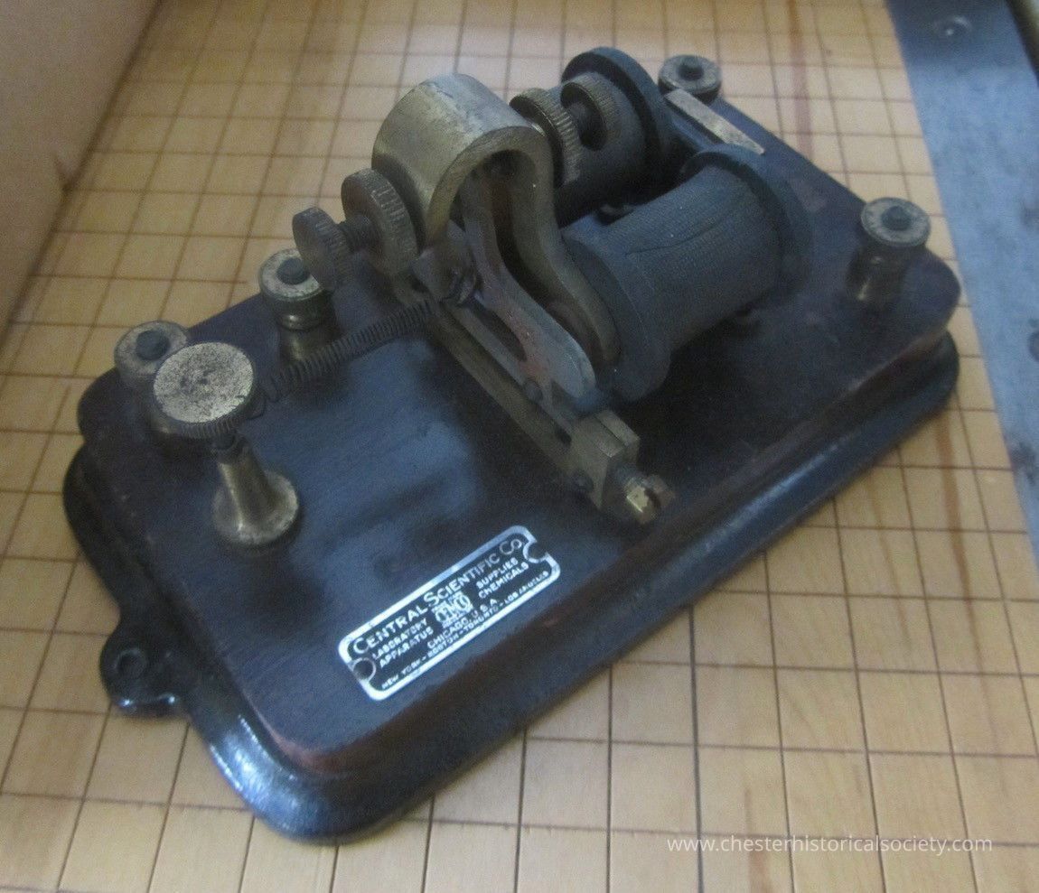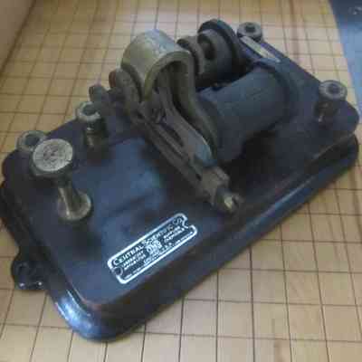 The image depicts an antique telegraph machine, which features a sturdy, dark-colored wooden base with metal components including screws, terminals, and a coil, suggesting its use in early communication technology. The device is likely to have been used for sending Morse code messages, indicative of the era before modern digital communication. Its craftsmanship and materiality reflect the industrial design of historical scientific instruments. A metal plate on the base details the manufacturer's specifics.