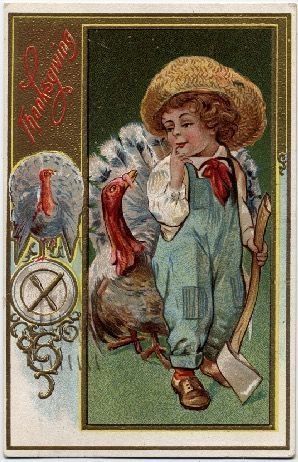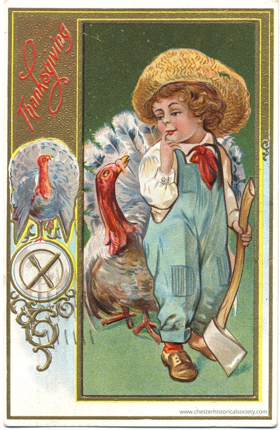 This colorful greeting postcard showcases a young child wearing blue overalls, a white shirt, and a broad-brimmed straw hat, standing thoughtfully with a finger on his lip, beside a large, colorful turkey. The child is holding an axe with the handle resting on the ground, suggesting a moment of contemplation. To the left, the word “Thanksgiving” is written in elegant red script, with an ornate gold and white border surrounding the scene. An inset shows a turkey and crossed utensils within a circular plate.
