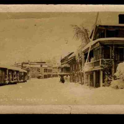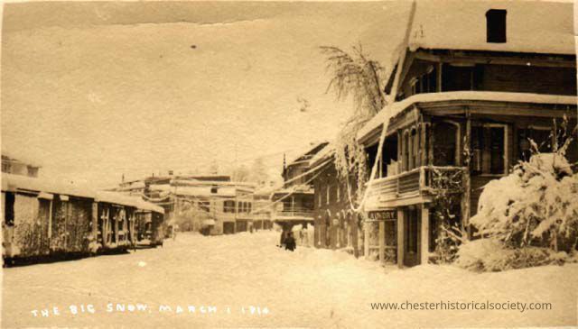 The black and white photo postcard captures snowy Main Street on March 1, 1916 as viewed from the Chester train station. Showing buildings heavily draped with snow and a few figures visible amidst the serene, winter-coated landscape. Signs on the buildings suggest the presence of businesses, while the old-fashioned architecture and transportation vehicles, almost obscured by snow, evoke a moment frozen in time, reflecting both the harsh weather conditions.Subject Place