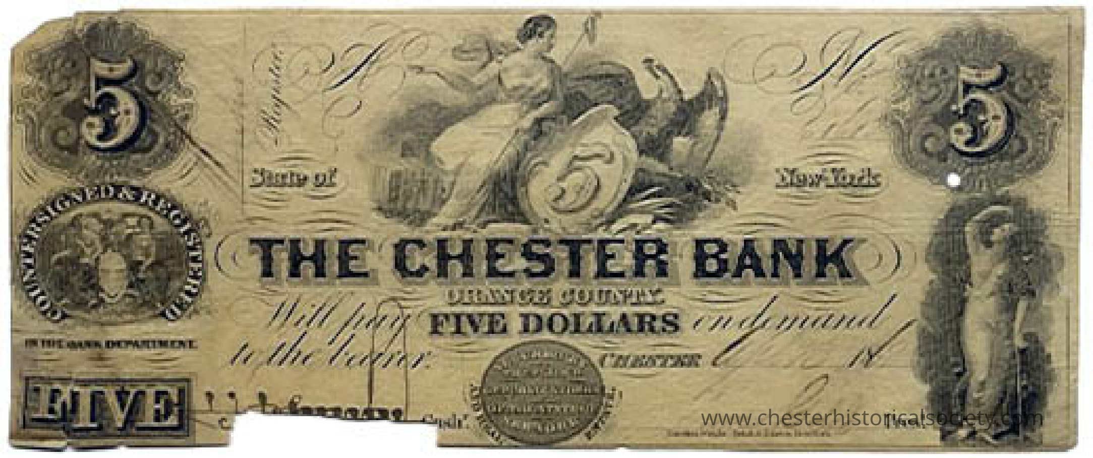 The image features a vintage five-dollar banknote from The Chester Bank, located in Orange County, New York. The design is ornate, with intricate patterns and illustrations, including a prominent numeral "5" on both the left and right sides of the bill. The center displays a detailed scene with a seated female figure holding a shield marked with the same numeral. The text "The Chester Bank" is boldly printed across the middle, with "Orange County" and "Five Dollars" below it. On the right, there is a depiction of a standing woman, adding a classical artistic element to the note. The bill has handwritten signatures and a date. The punched hole under the right side "5" signifies that this banknote was redeemed and canceled.