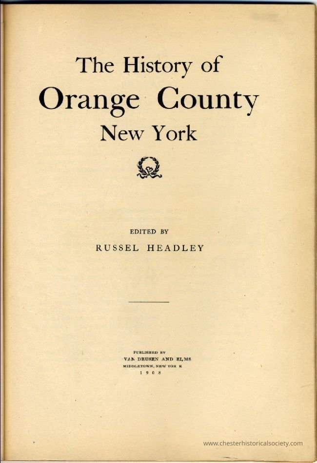 Melissa Moffatt Knapp's copy of "The History of Orange County New York," edited by Russel Headley, published by Van Deusen and Elms in Middletown, New York, in 1908.