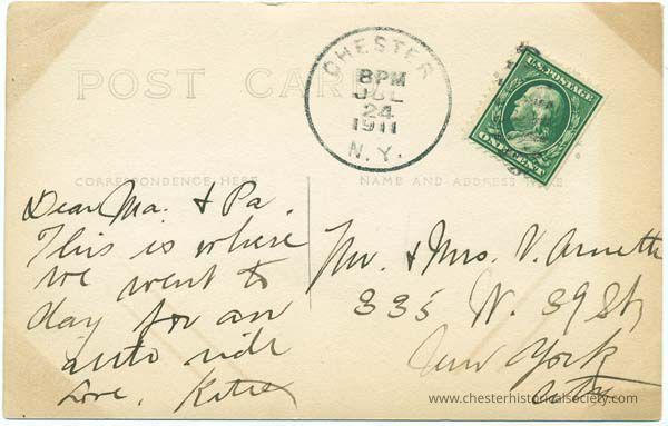 The image shows the back of an old postcard addressed to Mr. and Mrs. V. Arnette, located at 335 W. 39 St., New York City, featuring a green one-cent U.S. postage stamp in the upper right corner and a postmark from Chester, N.Y., dated July 24, 1911. It includes a handwritten message which reads: "Dear Ma & Pa, This is where we went to day for an auto ride. Love, Katie.”Subject Place