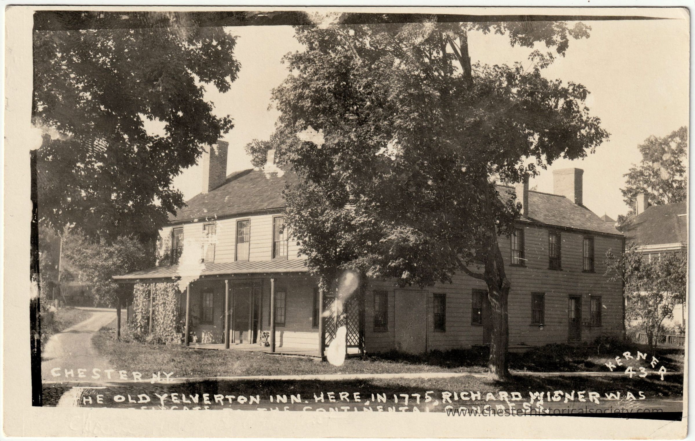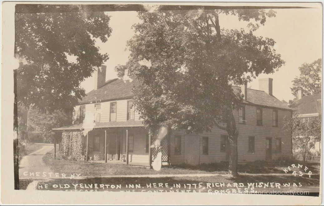 This monochrome photo postcard shows the Old Yelverton Inn located in Chester, NY, a historic structure captured in the early 20th century, surrounded by dense, leafy trees. The photograph is marked with an erroneous caption that identified the inn as a place where, in 1775, Richard Wisner [selected] delegate to the Continental Congress. Actually, Henry Wisner and John Haring of Orangetown were elected August 16, 1774 at the house Stephen Sloat as Orange County's delegates to the first Continental Congress. Here at the Yelverton Inn on September 3, 1774 he was approved by freeholders from Goshen and Cornwall. The inn is a two-story wooden building, featuring multiple chimneys and an attached porch covered built in 1765.Subject Person/Organization