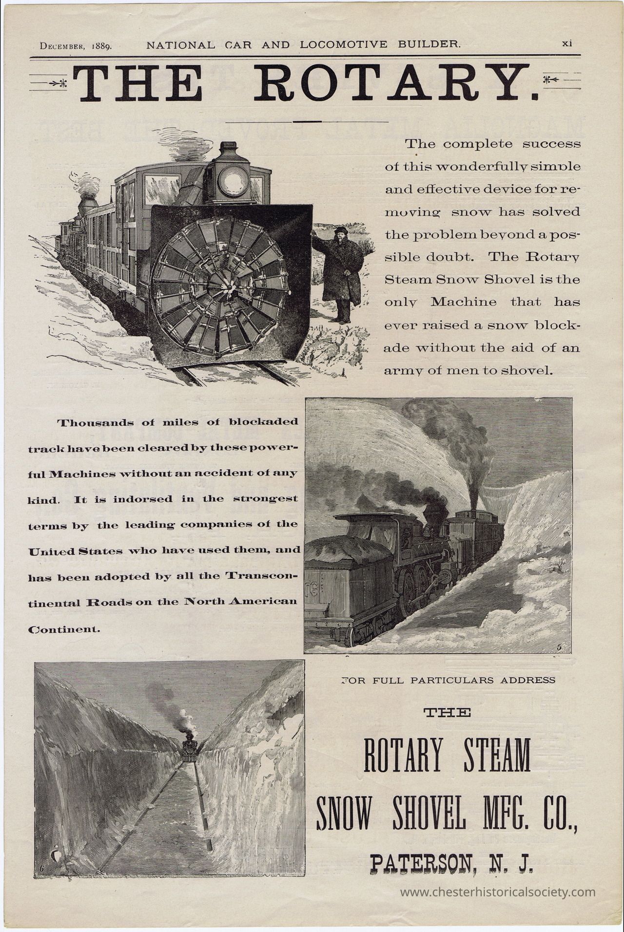 An advertisement from December 1889 for the Rotary Steam Snow Shovel, featured in the "National Car and Locomotive Builder" publication, displaying an illustration of a train equipped with a large rotary snowplow clearing snow from tracks; the text highlights its ability to clear blockades efficiently without accidents, being endorsed by leading United States companies and adopted by transcontinental railroads, and notes its manufacture by the Rotary Steam Snow Shovel Mfg. Co. in Paterson, N. J.Collection