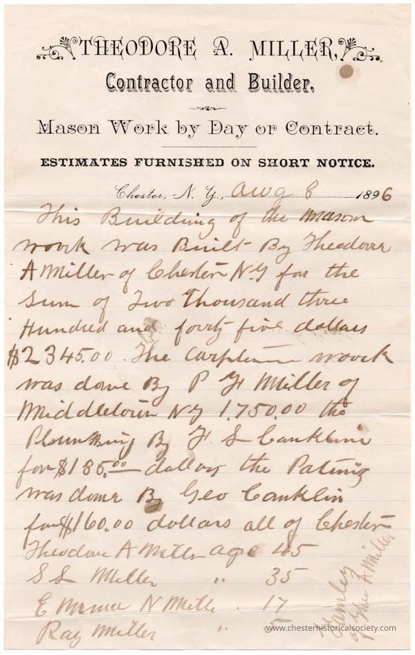 This Building of the Mason work was Built By Theodore A. Miler of Chester NY for the Sum of Two Thousand three Hundred and forty five dollars $2345.00. The carpenter work was done by P. G. Miller of Middletown NY 1,175.00 The Plumbing By G S Conklin for $185.00 dollars the Painting was done by Geo Conklin for $160.00 all of Chester