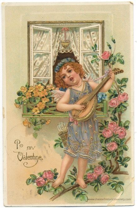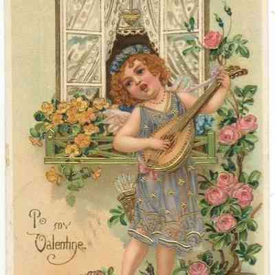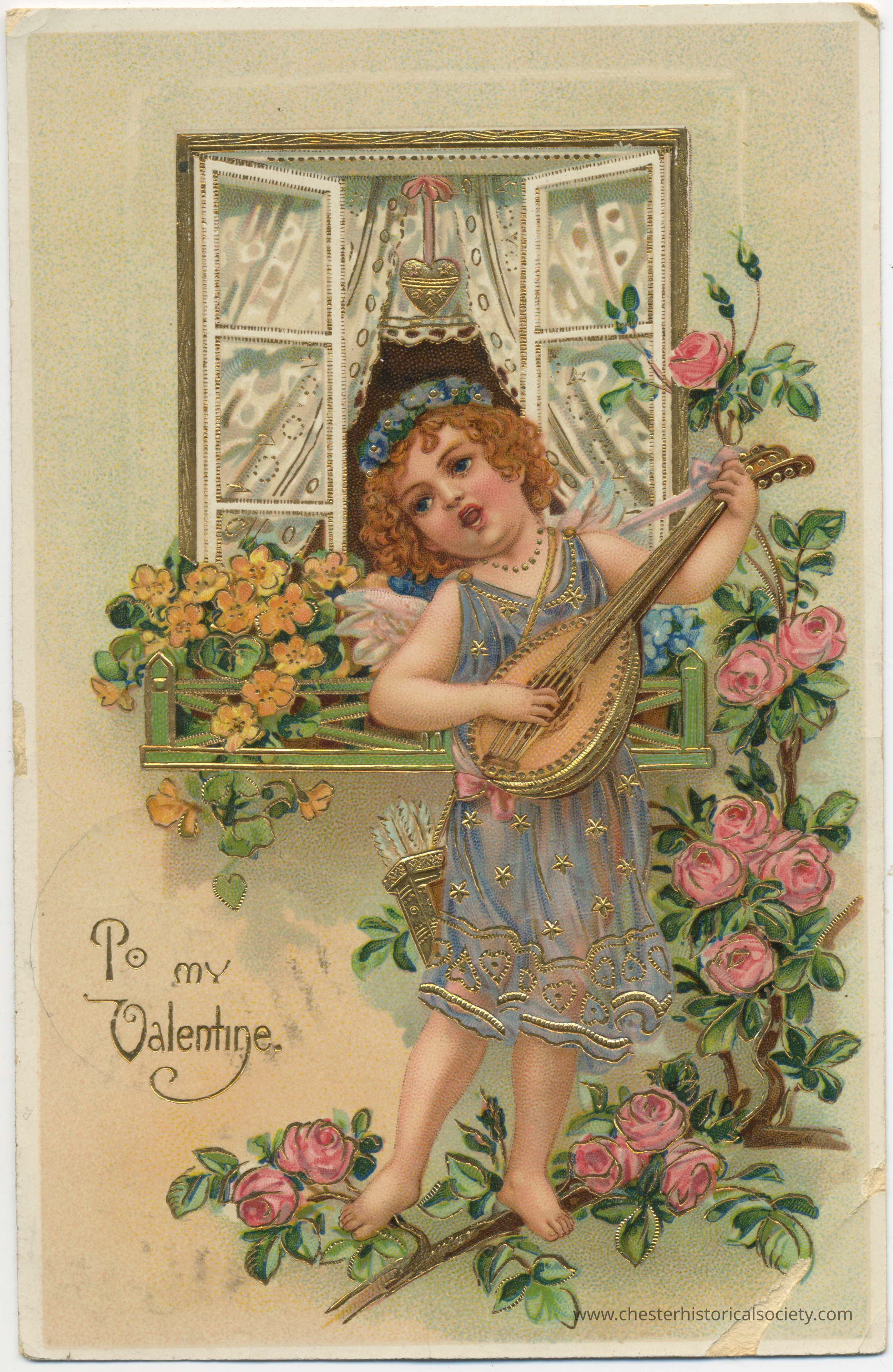 This postcard is a vintage Valentine's Day greeting featuring a cherubic young girl with curly blond hair, playing a large, ornate harp. She is dressed in a delicate, light blue gown adorned with gold stars and trim, standing barefoot among blooming rose bushes. In the background, an open window with a lace curtain shows a serene blue sky. Below the image, the phrase "To my Valentine" is elegantly scripted, enhancing the romantic and nostalgic feel of the card. The address side of this old postcard, printed in Germany, features meticulously detailed embossed floral patterns. It displays a green one-cent U.S. postage stamp featuring Benjamin Franklin, postmarked "MONTGOMERY N.Y. 730A FEB 121910." The card is addressed to "Master George Hawkins, Chester, Orange Co., N.Y." with handwritten text from G. B. Gillerkei.Subject Person/Organization