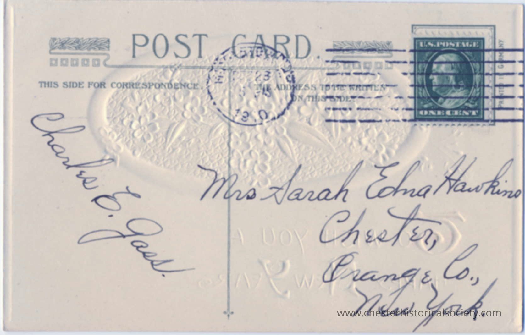 This image shows an old postcard addressed to Mrs. Sarah Edna Hawkins in Chester, Orange County, New York, featuring a one-cent U.S. postage stamp and a postmark dated April 23, 1905. The card has an embossed floral design and the words "POST CARD" at the top.Subject Person/Organization
