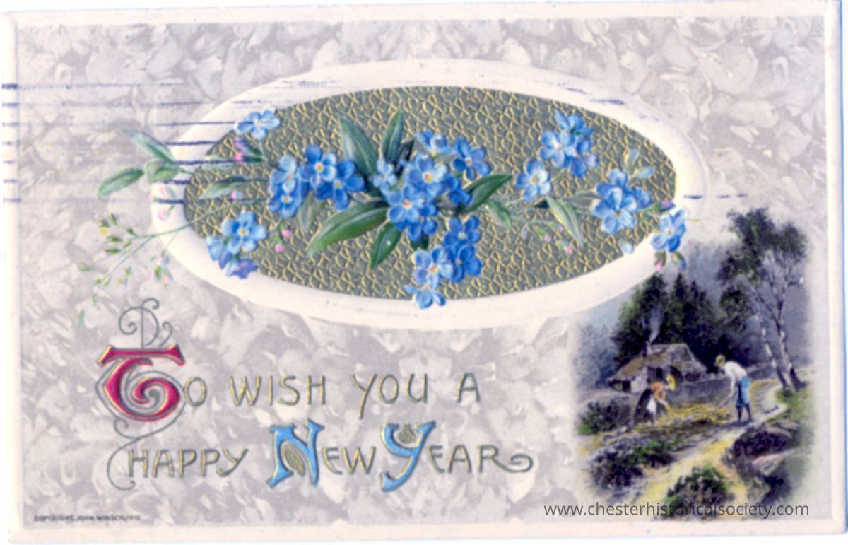 This illustrated New Year's greeting postcard features a floral motif with vibrant blue forget-me-nots inside an oval frame against a textured background. Below the floral arrangement, ornate, colorful lettering reads "To wish you a Happy New Year." The card merges floral elements with a serene rural scene in the lower right corner, depicting a small group of people near a cottage surrounded by trees.