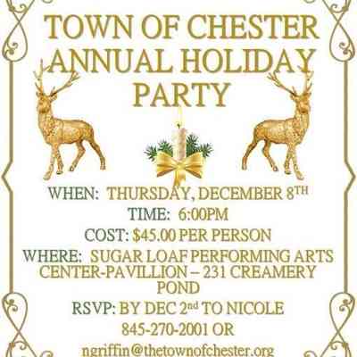 The image is a2022 flyer for the Town of Chester's Annual Holiday Party, featuring festive gold and green colors with decorative deer and ornate border patterns. It provides details such as the date (Thursday, December 8th), time (6:00 PM), cost ($45 per person), and location (Sugar Loaf Performing Arts Center-Pavilion, 231 Creamery Pond). It requests RSVPs by December 2nd to Nicole, either by phone at 845-270-2001 orCategory