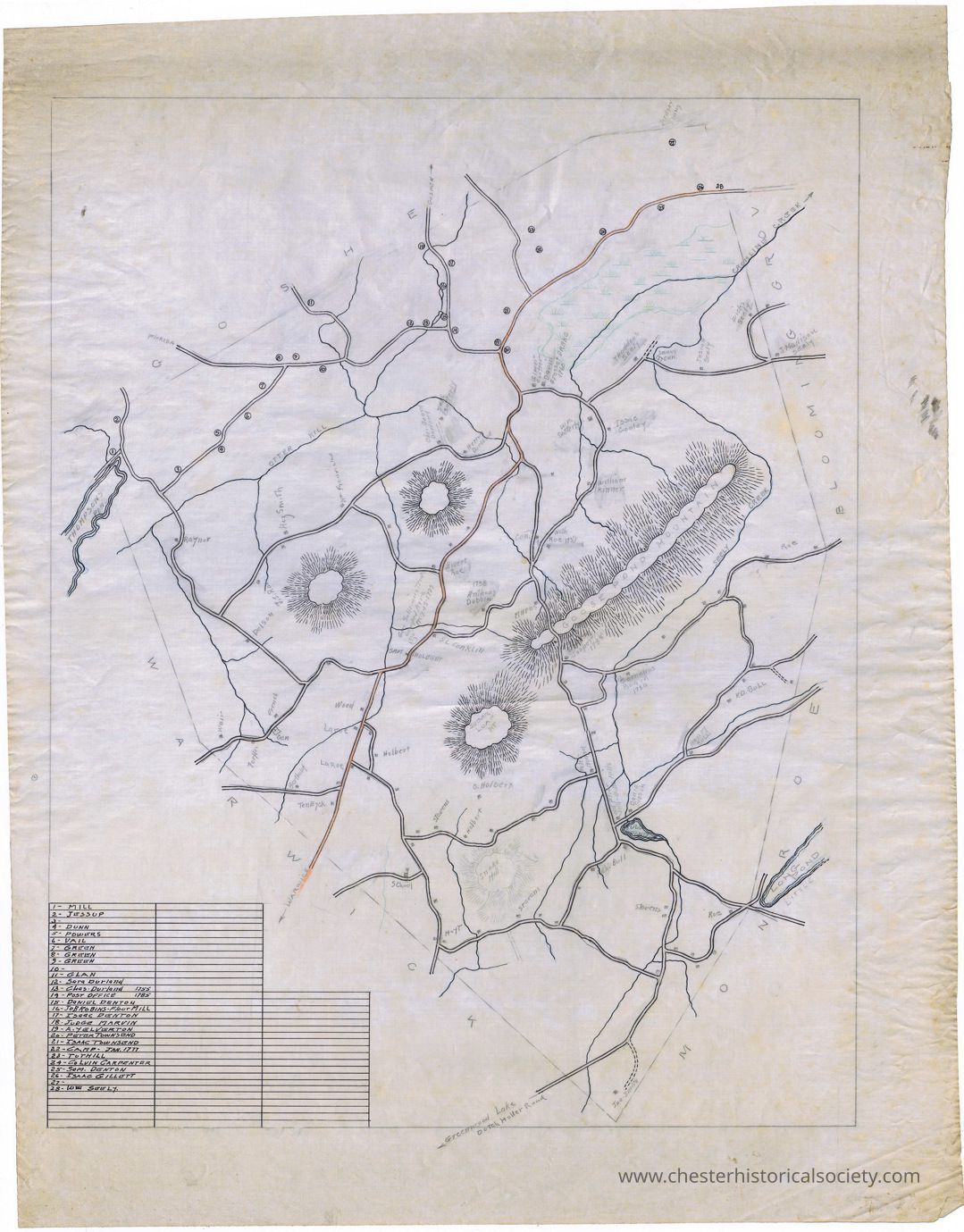 Town of Chester Map on linen, with early inhabitants, roads, mountains, and geographical features depicted.Collection