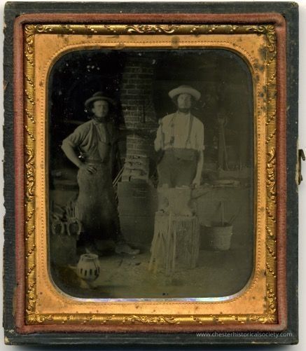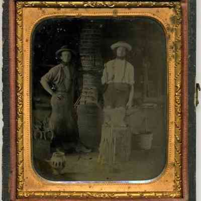 The image depicts two men standing in a rustic workshop-like setting, featuring tools, buckets, and a brick chimney. The man on the left stands casually with one hand in his pocket, wearing a rounded hat and dungarees, while the man on the right, wearing a wide-brimmed hat, suspenders, and a rolled-up shirt, stands more squarely. They are framed by an ornate, golden, embossed border. The case is missing its cover.