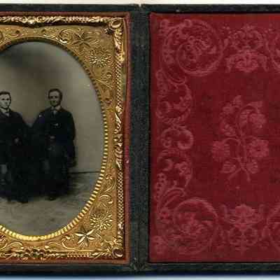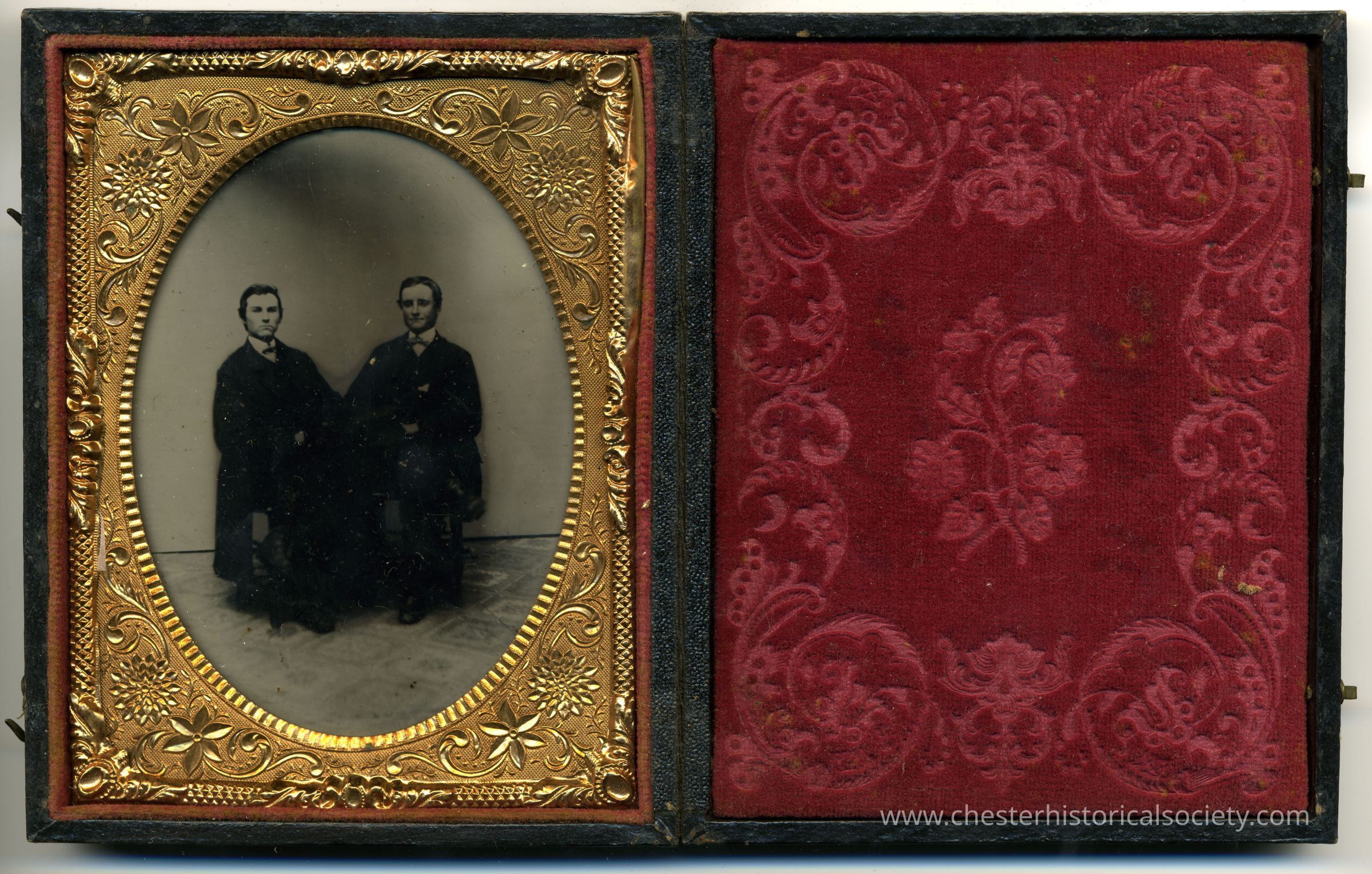 The image displays an ornate antique daguerreotype featuring two seated men in dark suits, captured within a richly decorated gilded oval frame, housed in a folding case with a luxuriously patterned red velvet cover on the right, exemplifying a typical 19th-century style used for preserving precious photographic portraits.