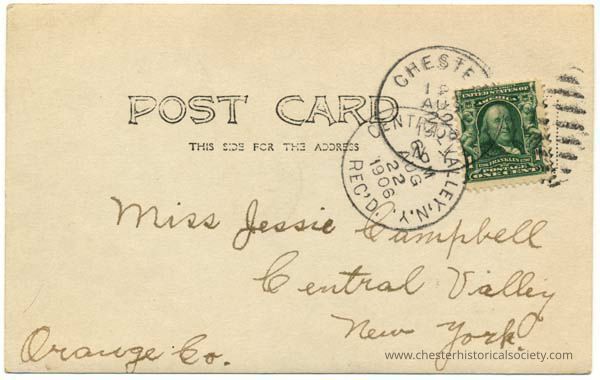 This postcard was addressed to Miss Jessie Campbell in Central Valley, Orange Co., New York, stamped with a green one-cent Benjamin Franklin stamp, postmarked August 22, 1920, from Chester, NY.Subject Place