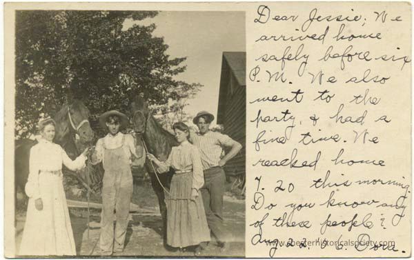 Dear Jessie; We arrived house safely be before six P. M. We also went to the party & had a fine time. We reached house 7.20 this morning. Do you know any of these people?