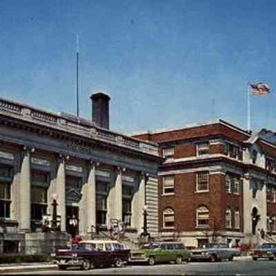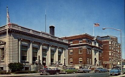 Photo post card of US Post Office & City Hall, and Mitchell Inn. Mitchell Inn to right was taken down in 1964.Create Date