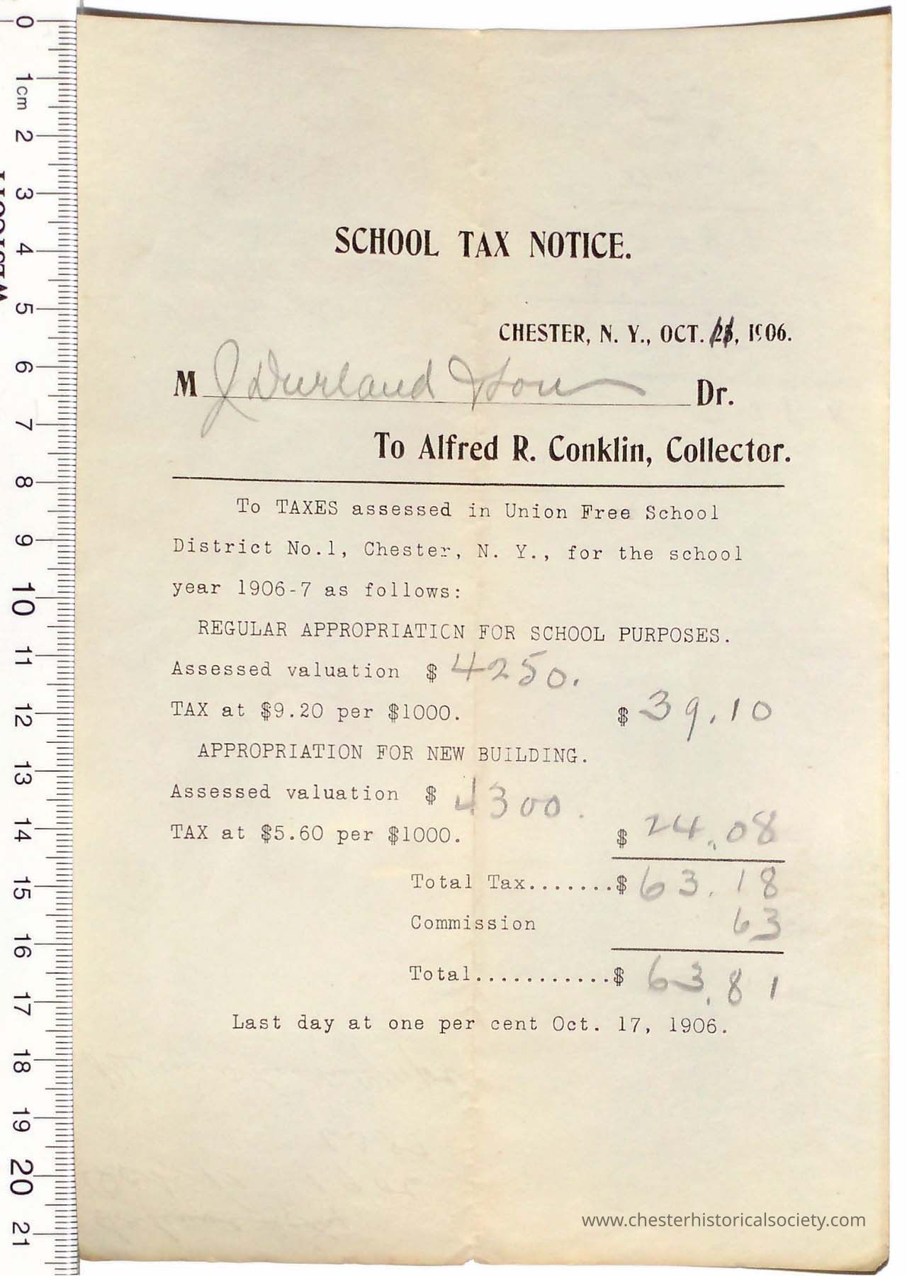1906 - Chester School Tax Receipt