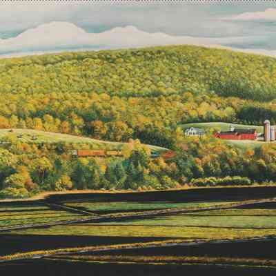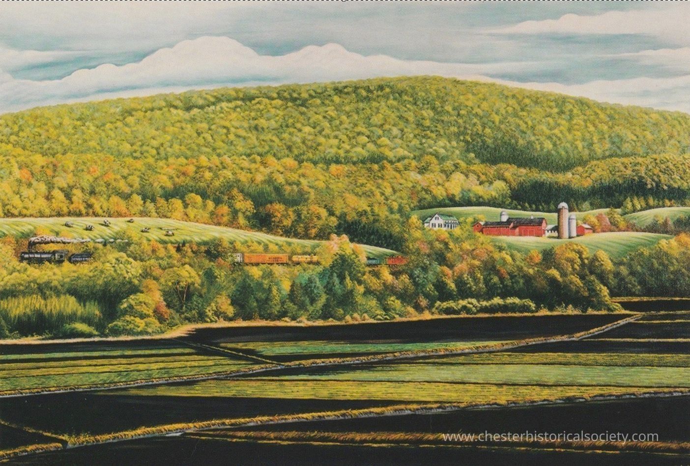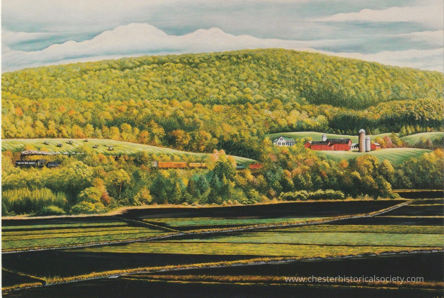 View from High Street, Chester, NY, showing Goosepond Mountain in the background. The Lehigh and Hudson River Railroad train steams across Chester's famous black dirt, which produces high quality onions and lettuce. Original painting by Chester artist, Tom LaBarbera.