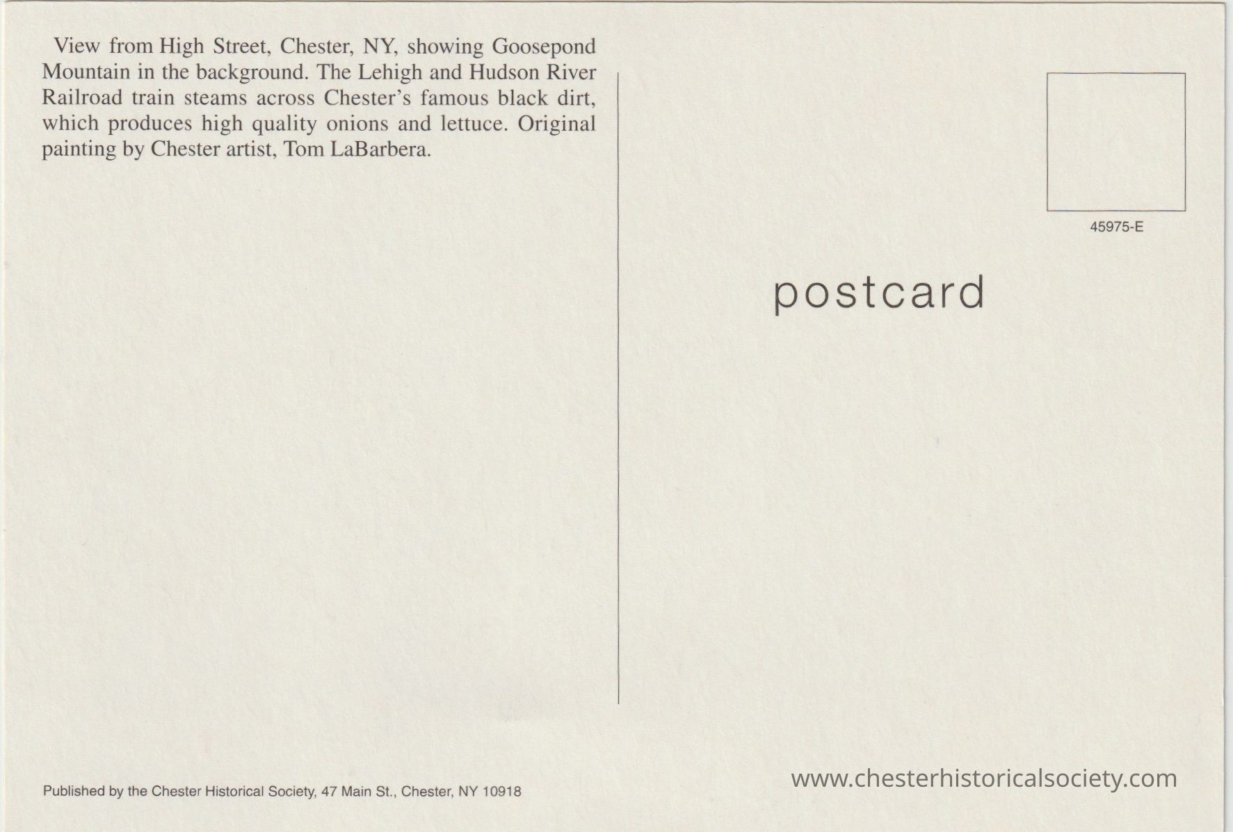 This postcard captures a painting by Chester artist, Tom LaBarbera - a vibrant rural landscape during autumn, showcasing rolling hills covered in dense forests with colorful foliage . In the foreground, dark, black dirt fields stretch across, leading to a scene where a train pulled by a steam locomotive snakes through the countryside past Lupinski farm, including a white house and a traditional red barn with silos. Address side of the postcard, featuring a detailed description of a viewpoint from High Street in Chester, NY, with Goosepond Mountain in the background and the presence of the Lehigh and Hudson River Railroad. It references Chester's black dirt, known for producing high-quality onions and lettuce, and credits the original painting to a Chester artist named Tom LaBarbera. The postcard is published by the Chester Historical Society, located at 47 Main St., Chester, NY.Subject Person/Organization