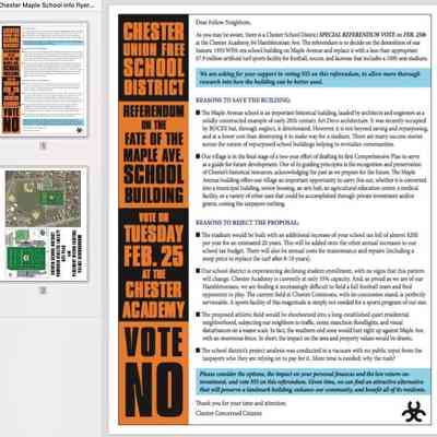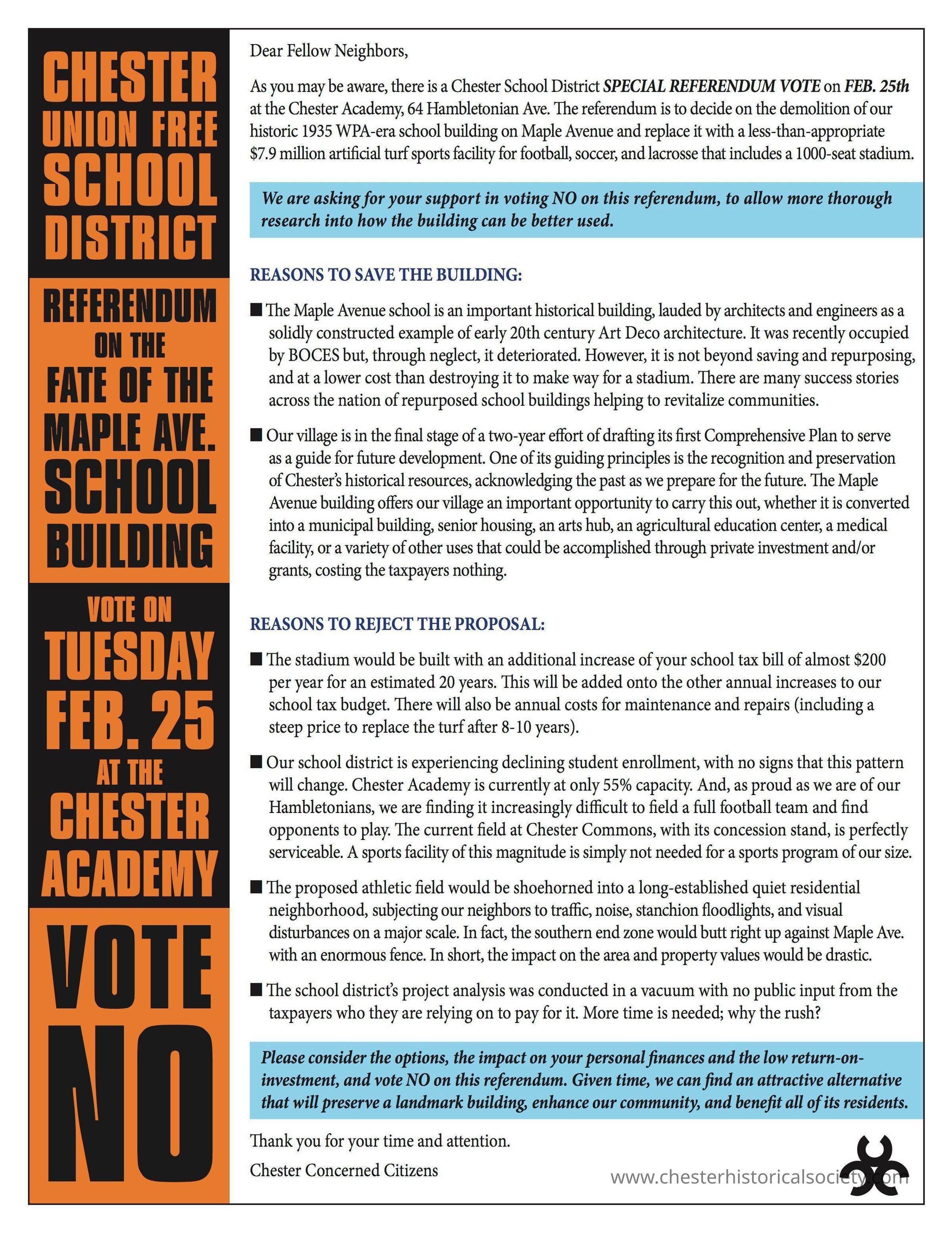As you may be aware, there is a Chester School District SPECIAL REFERENDUM VOTE on FEB. 25th at the Chester Academy, 64 Hambletonian Ave. e referendum is to decide on the demolition of our historic 1935 WPA-era school building on Maple Avenue and replace it with a less-than-appropriate $7.9 million arti cial turf sports facility for football, soccer, and lacrosse that includes a 1000-seat stadium.