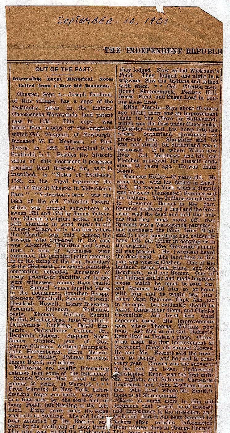 Chester, Sept. 4.-Joseph Durland, of this village, has a copy of the testimony taken in the historic Cheesecocks-Wawavanda land patent case in 1785. This copy was made from a copy of the original, which Col. Weygant, of Newburgh, furnshed W. H. Nearpass, of Port Jervis, in 1899. The original is at Southold, L. I. Besides the historic value of this document it possesses peculiar local interest, for, as it is inscribed, is "Notes of Evidence, 1785, on the Tryal beginning the 19th of May at Chester in Yelverton's Barn." "Yelverton's barn" was the barn of the old Yelverton Tavern, which was erected somewhere between 1751 and 1755 by James Yelverton, Chester's original setler, and is still standing in good repair in old Chester village, as is the barn where the "Tryal" was held. Among the lawyers who appeared in the case was Alexander Hamilton and Aaron Burr. A host of witnesses were examined, the principal point seeming to be the fixing of the true boundary of the Highlands, on which point the contention defended. Ancestors of many prominent families of to-day were witnesses, among them Daniel Burt, Samuel Vance (spelled Vantz in the document), Jonathan Knapp, Ebenezer Woodhull, Samuel Strong, Hezekiah Howell, Henry Brewster, Jeremiah Ooleman, Nathaniel Seely, Thomas Welling, Samuel Moffat, Stephen Case, Jesse Woodhull, Deliverance Conkling, Cadwallader Colden, David Benjamin, Benjamin Osborn, Stephen Sloat, James Clinton, (son of Gov. George Clinton), William Thompson, Elihu Marvin, Jobn Hardenbergh, Phineas Rumsey, Ebenezer Holley, James Board, and others.