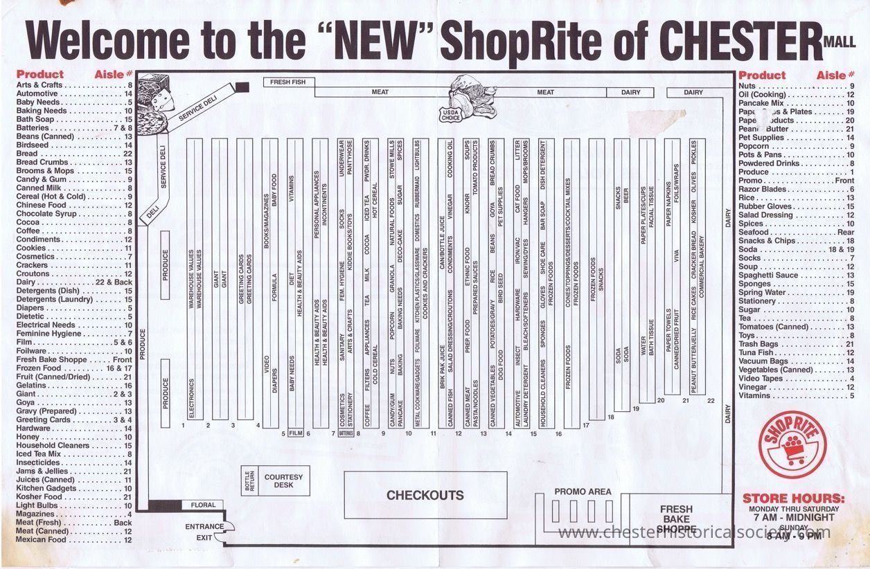 Welcome to the "New" ShopRite of Chester Mall flyer featuring the store's floor plan with specific aisle numbers and corresponding product categories, such as arts and crafts, automotive, baby needs, and dairy, among others. The map highlights various sections like fresh fish, service deli, meat, dairy, and promo area, with checkout lanes located centrally.Category