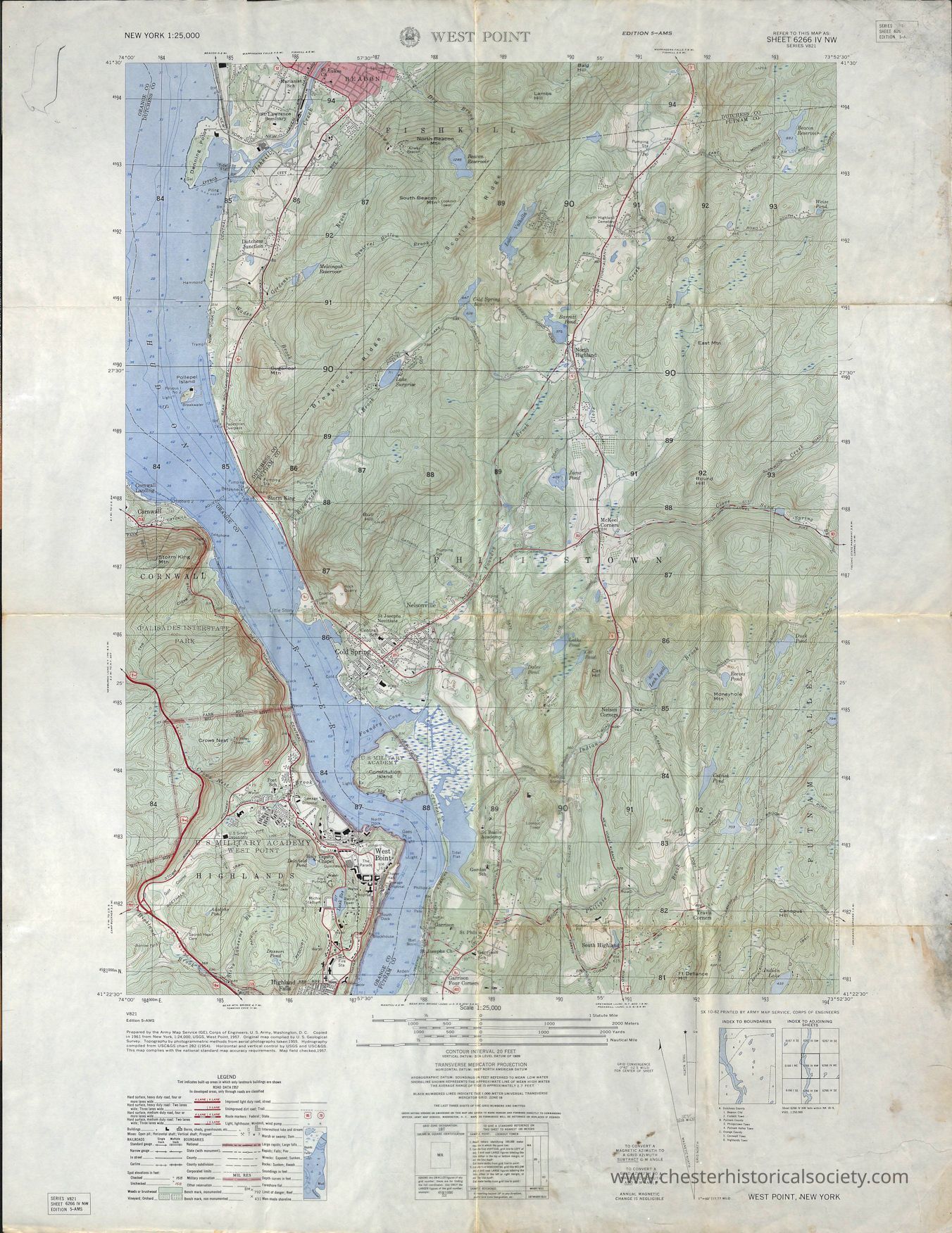 Prepared by the Army Map Service (GE), Corps of Engineers. U.S. Army, Washington. D. C. Copied in 1961 from New York, 1:24,000, USGS, West Point. 1957. Original map complied by U.S. Geological Survey. Topography by photogrammetric methods from aerial photographs taken 1955. Hydrography compiled from USC&GS chart 282 (1954). Horizontal and vertical control by USGS and USC&GS. This map complies with the national standard map accuracy requirements. Map field checked,1957.