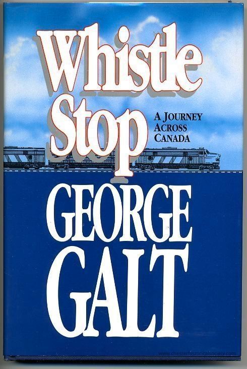 The image displays the cover of a book titled "Whistle Stop: A Journey Across Canada" by George Galt. The cover features a blue sky with clouds at the top, transitioning into a deeper blue towards the bottom. Illustrations of a train extend horizontally across the upper portion, suggesting travel and movement. The title "Whistle Stop" is prominently written in large, bold, white letters with a red outline, creating contrast and emphasis. Beneath the title, the author's name, "George