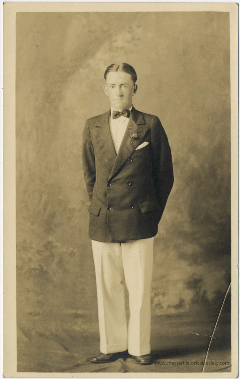 A monochrome photograph of William C. Russell, standing wearing a double-breasted suit and bow tie.Subject Person/Organization
