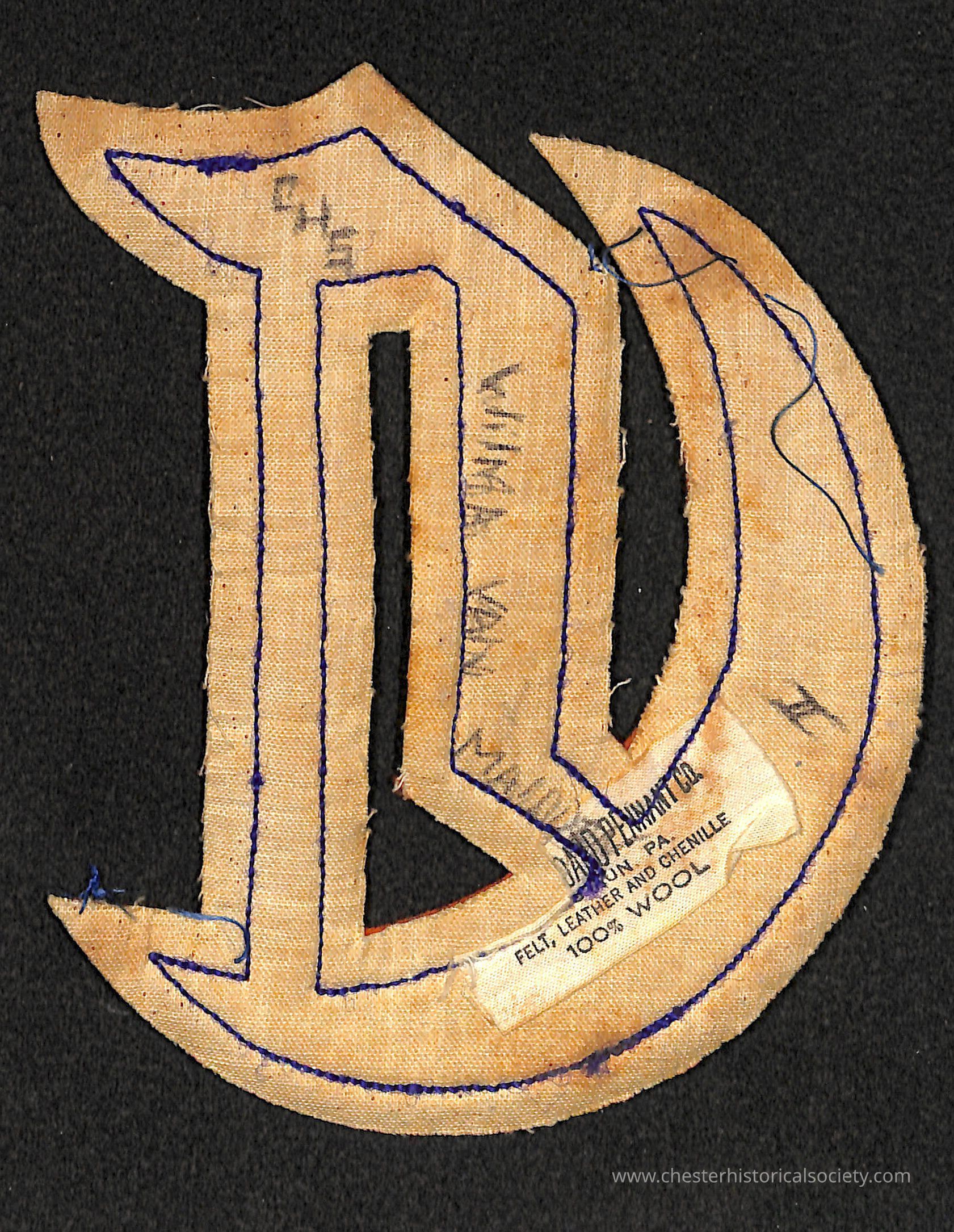 Wilma Van Maiden's Chester School 'Letter.' The reverse shows the fabric patch in the shape of a stylized letter, overlaid with blue stitching, where various handwritten annotations are visible, such as "CHS" and "Wilma Van Maiden," and a manufacturer's label lisitng materials like felt, leather, chenille, and wool, with a percentage noted as 100% wool, all set against a black background which contrasts with the textured fabric and intricate blue thread stitching.Context