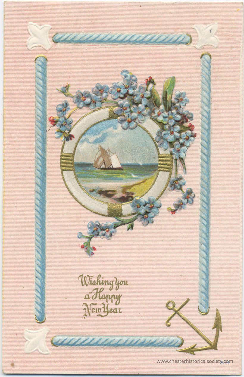 An illustrated New Years greeting postal card from Master George Hawkins’ scrapbook.