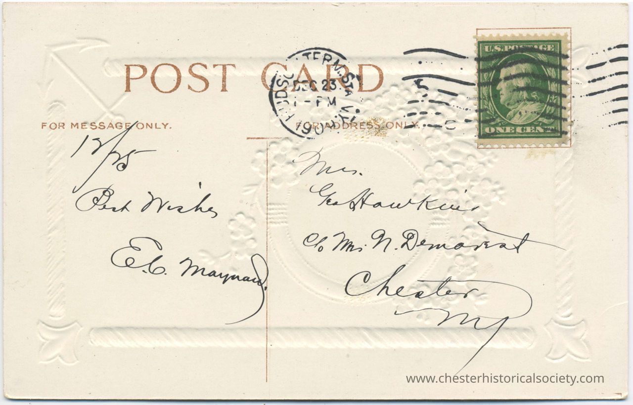 The reverse displays an old postcard with a white embossed featuring floral designs and a centralized section marked "POST CARD." It is addressed to "Mrs. Geo. Hawkins" with handwritten text on it, including a postmark date from Hudson Term. Sta., NY, and a one-cent green U.S. postage stamp depicting Benjamin Franklin.Subject Person/Organization
