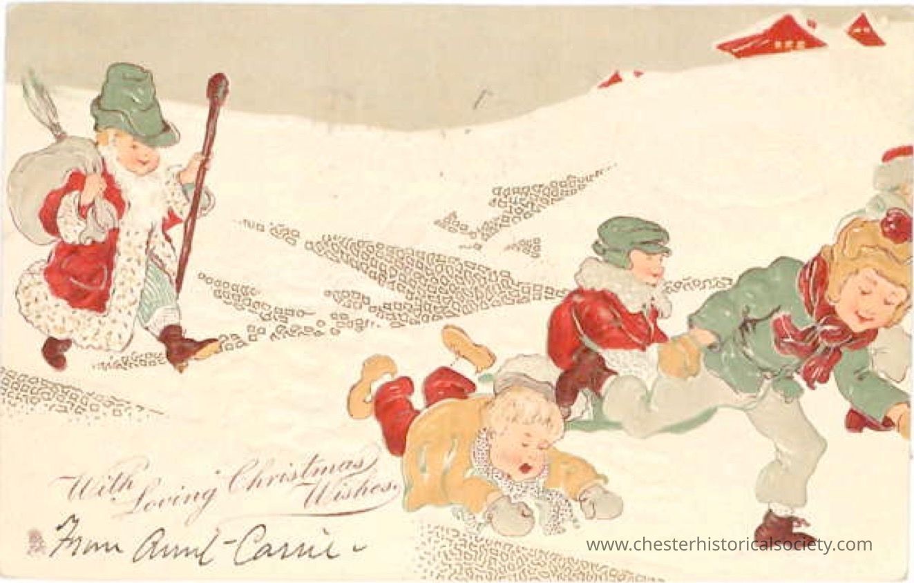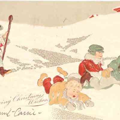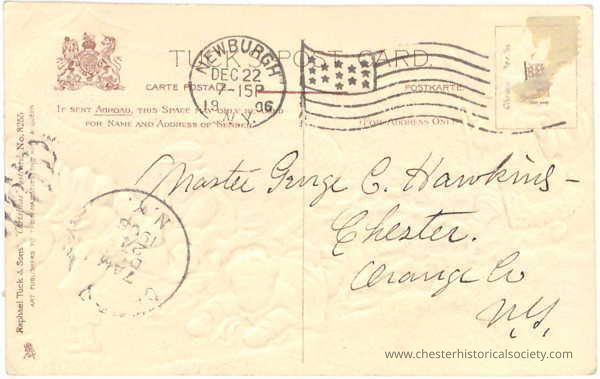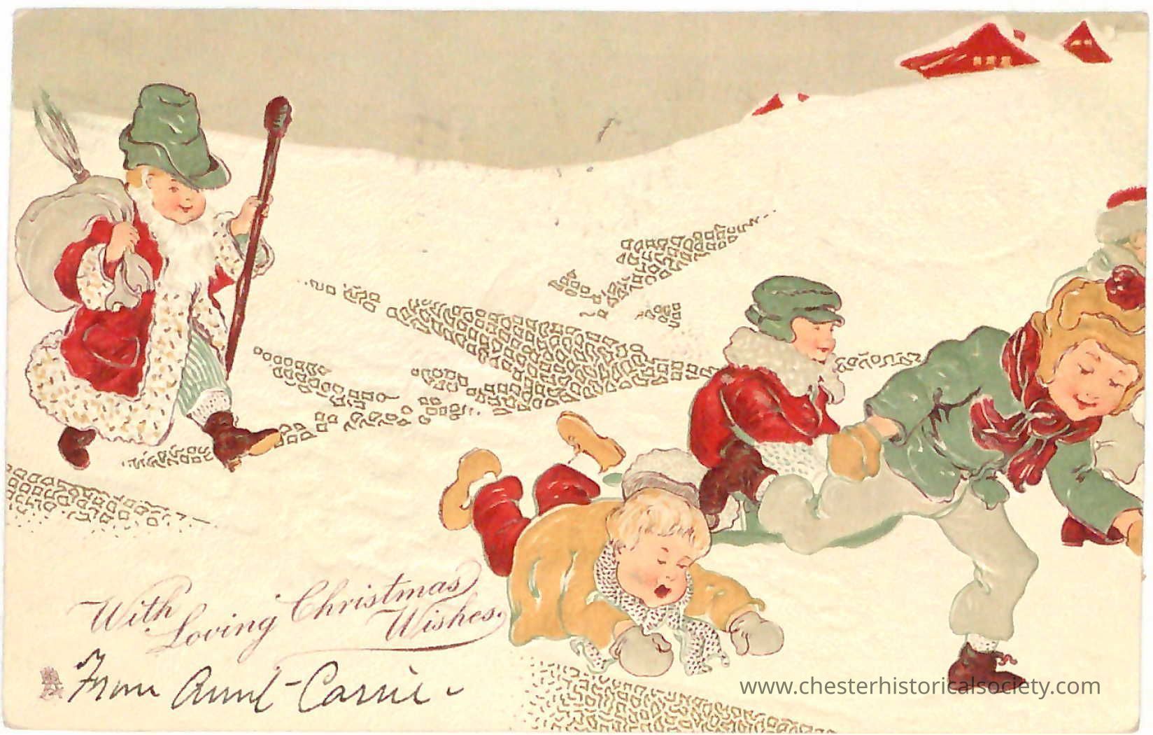 An illustrated postal Christmas greeting card sent to Master George C. Hawkins from Aunt Carrie