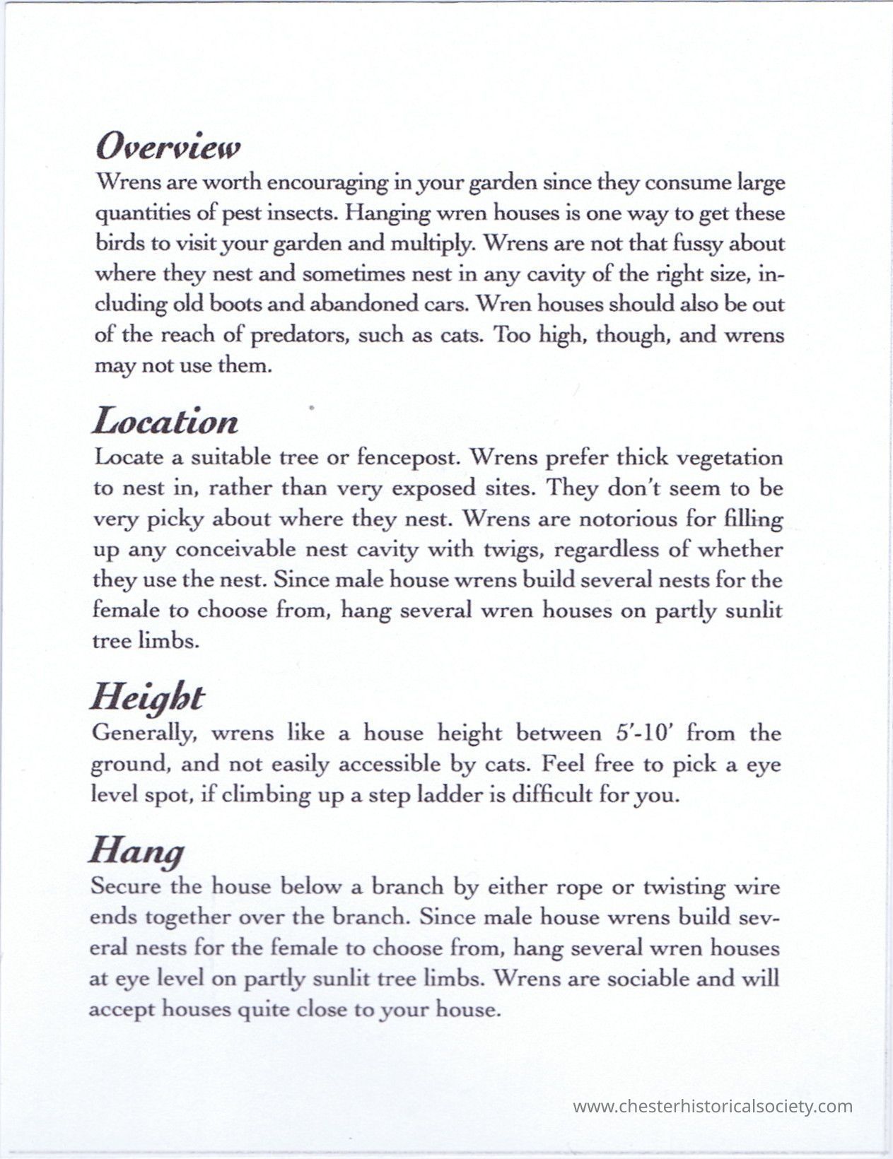 Wrens are worth encouraging in your garden since they consume large quantities of pest insects. Hanging wren houses is one way to get these birds to visit your garden and multiply. Wrens are not that fussy about where they nest and sometimes nest in any cavity of the right size, including old boots and abandoned cars. Wren houses should also be out of the reach of predators, such as cats. Too high, though, and wrens may not use them.