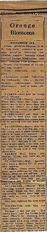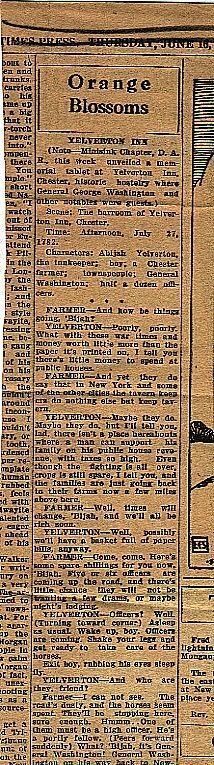 A vintage newspaper clipping titled "Orange Blossoms," detailing the unveiling of a memorial tablet at the Yelverton Inn and theatrical play sponsored by the Minisink Chapter of the D.A.R. featuring characters: Abijah Yelverton, the innkeeper, and a 'farmer.'Context