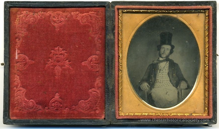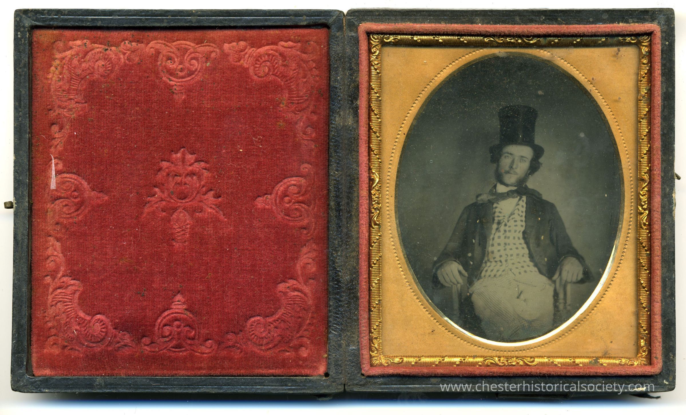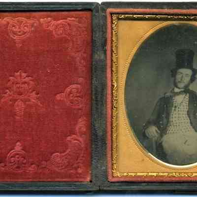 The image displays an antique daguerreotype portrait of a young man seated, dressed in 19th-century attire, featuring a dark coat, vest, and a cravat, with a top hat placed fashionably askew on his head. The photograph is encased in a hinged box, the left side of which is lined with red velvet embossed with ornate floral patterns, while the right side frames the photograph with a golden embellished oval trim.