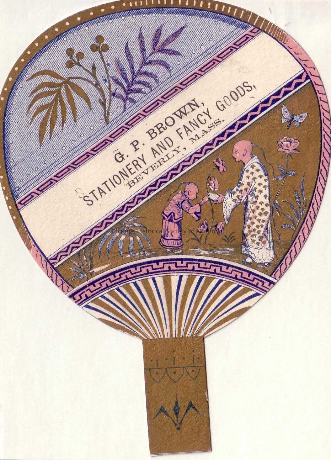 Front: This tradecard is shaped like a fan. The handle of the fan is in gold with a line design on it. The body of the fan is bordered half way by a dotted gold border and also a pink border with blue diagonal lines. Seperated in the middle of the tradecard is the advertisement for G.P. Brown Stationery & Fancy Goods, Beverly Mass. The upper half of the seperated tradecard holds a design of two big leaves and a flower against a blue stripe background and the bottom half of the seperated tradecard has an illustration of a boy and a man dressed in traditional robes and wearing their hair in a queue, picking flowers and while a butterfly flies around them.