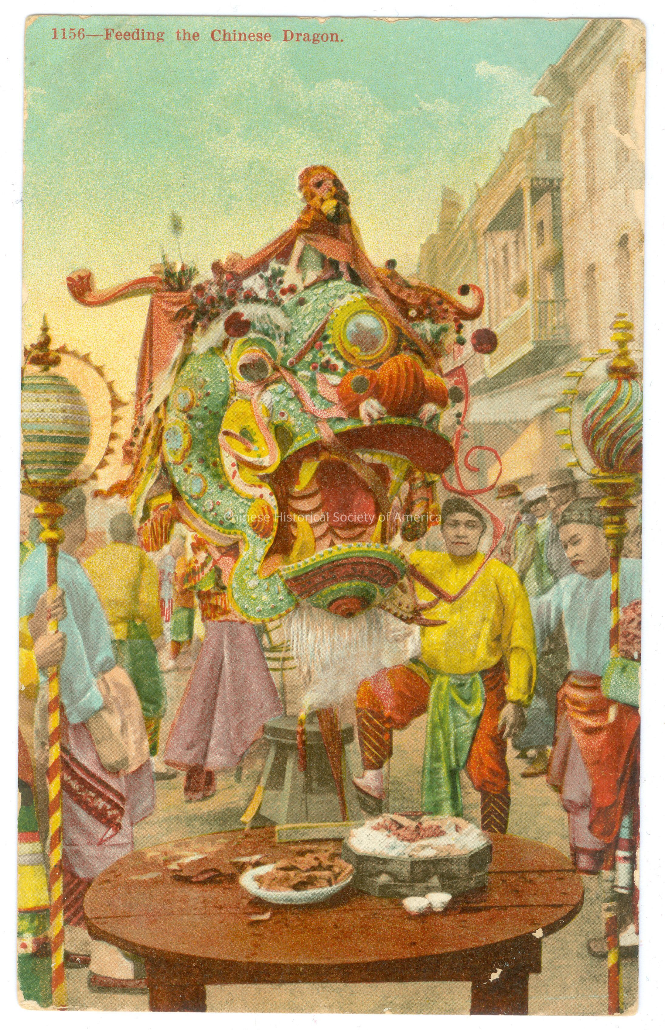 Color. Photo. SF; Parades: Up close view of a dragon head where a man in yellow is holding the head with a foot on a stool, the head is in front of a red table that is holding a plate of stuff and a box of sweets, there are people surrounding it.