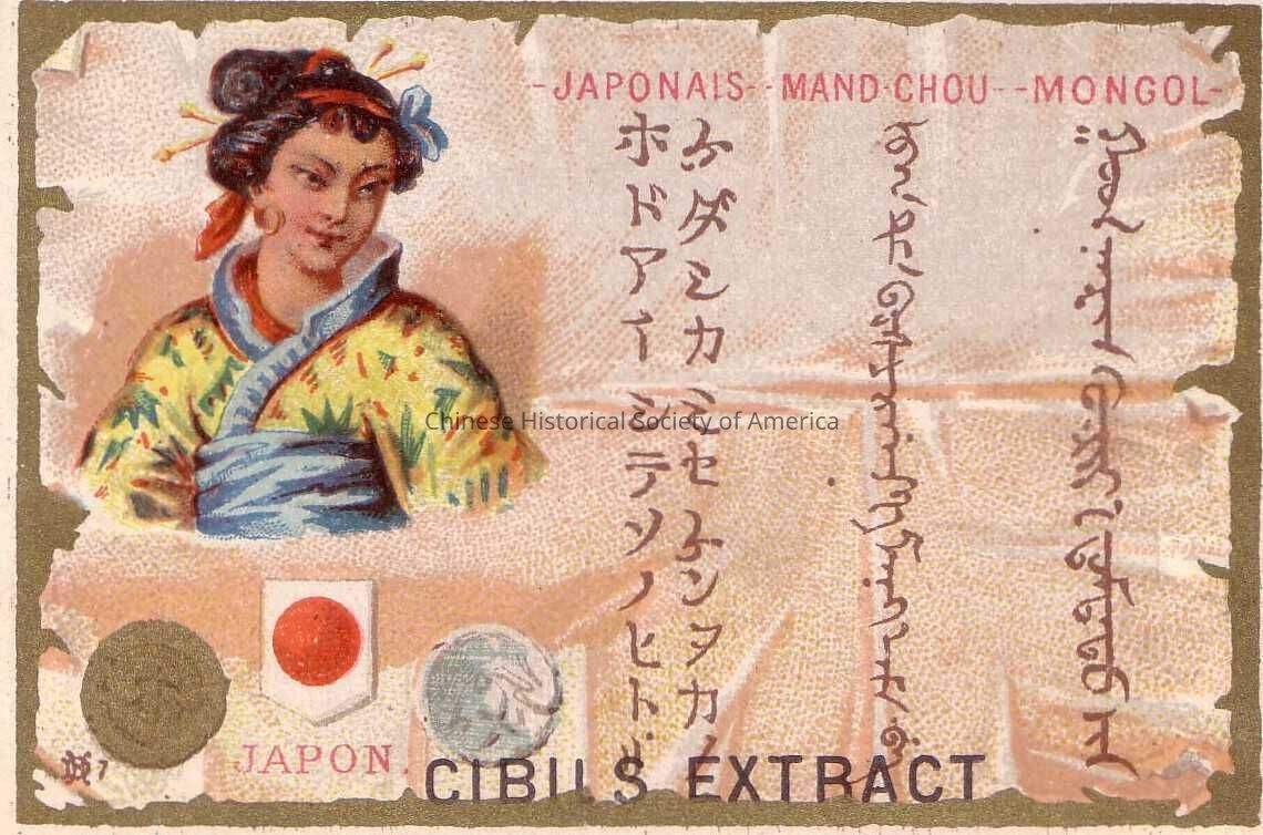 Front: On the upper left hand corner a Japanese woman is illustrated wearing a blue and yellow kimono with a variety of head trinkets in her hair. Illustrated beneath her are different symbols of Japan, including the flag, and Japanese money. In Japanese calligraphy, four different vertical columns are written out. The different notations written in English around the tradecard are the following: Japonais-Mand-Chou-Mongol, Japon, and Cibils Extract.