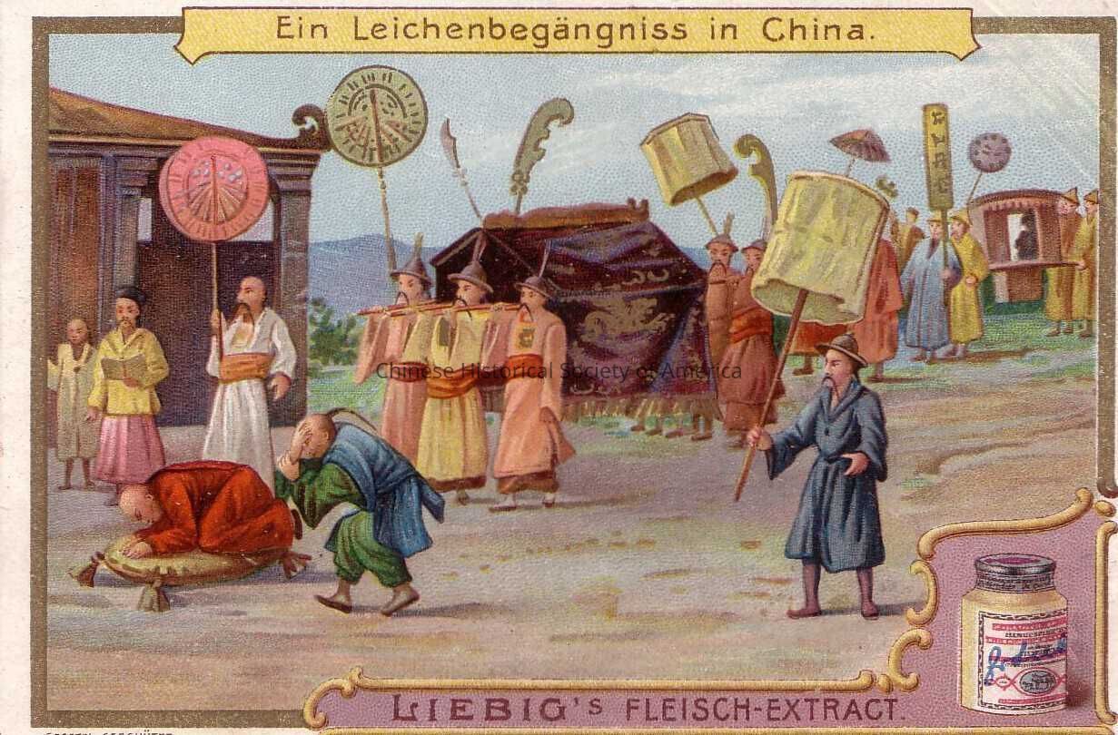 Front: In a parade possession, at the center are six men holding a carriage decorated with a black and gold cloak. Men holding colorful lanterns and fans walk with the carriage as its begins to pass a village. Toward the left of the tradecard, two men in red and in green and blue are bowing, one on a gold color pillow, and the other in the process of bowing. On the lower right hand corner is an illustration of the Liebig's Fleisch-Extract product and highlighted in yellow at the top is the following: "Ein Leichenbegangniss in China."