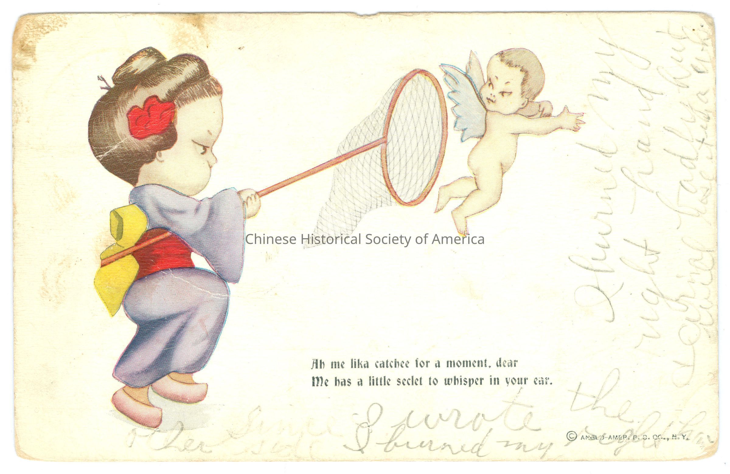 Color. Illus. Caricatures; Valentine Cards; Women: A Japanese woman wearing traditional purple clothing with a red and yellow sash, she has a red flower in her hair and she is holding a net ready to catch a little angel in the air.