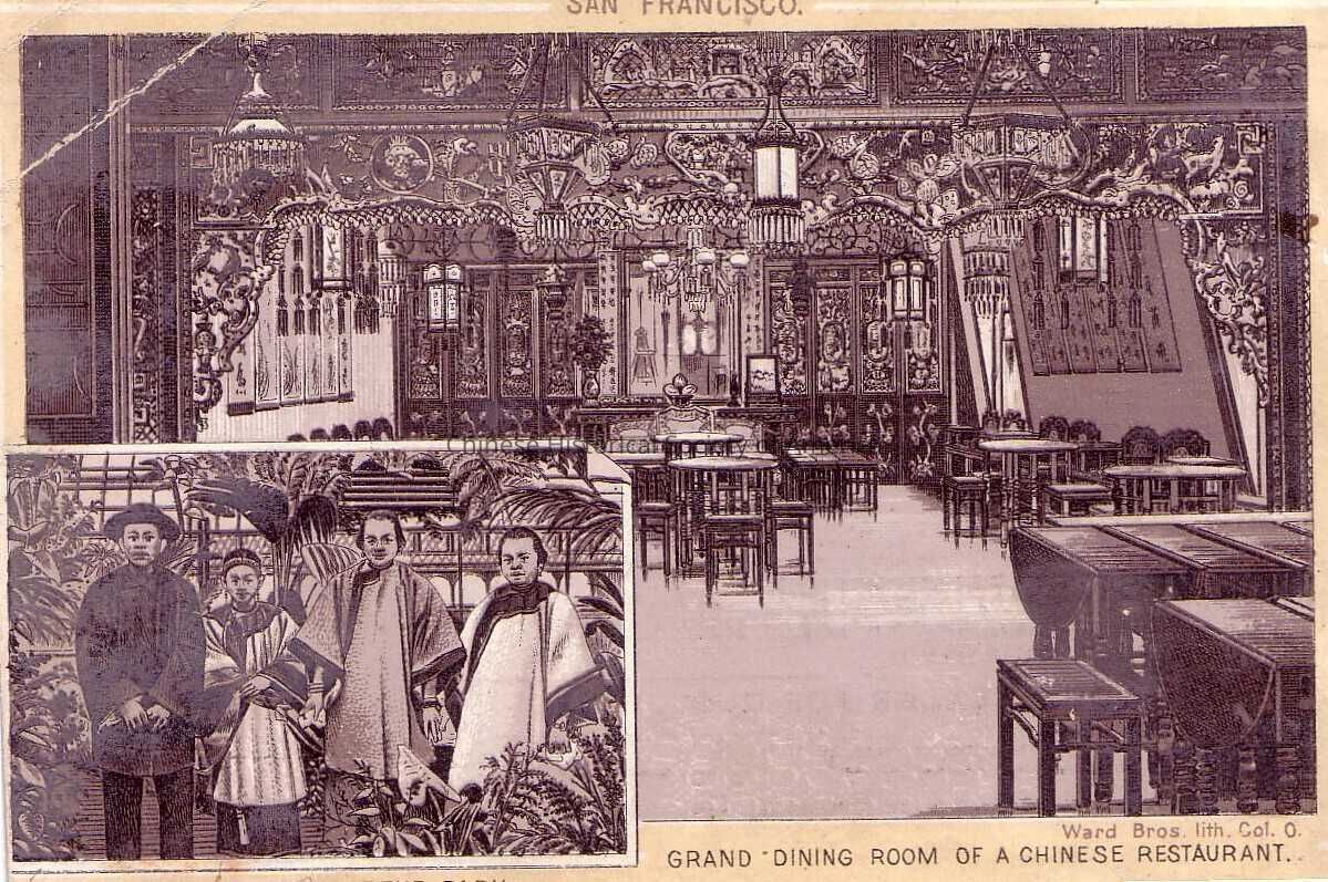 Front: On this tradecard there are two different illustrations. The one in the front that covers the whole tradecard is of a "Grand dining room of a Chinese restaurant," in which illustrated is a dining room with many tables and chairs, and hanging from the ceiling are lanterns, and on the walls there are many different paintings. In an insert, there is an illustration of a "Chinese Family at the Park," in which a man and three woman are posing and behind them there are plants and a greenhouse type building. Written on the top border is the word San Francisco.