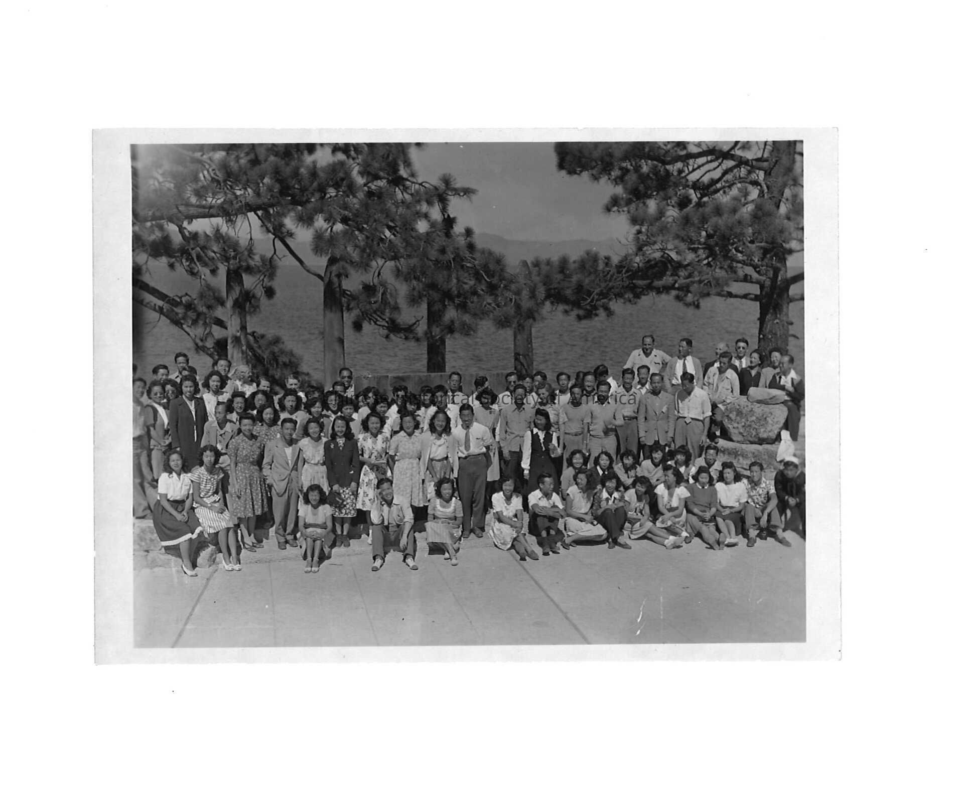Black and white photo of a large delegation at Angel Island taking a group photo. The bay and trees decorate the background.