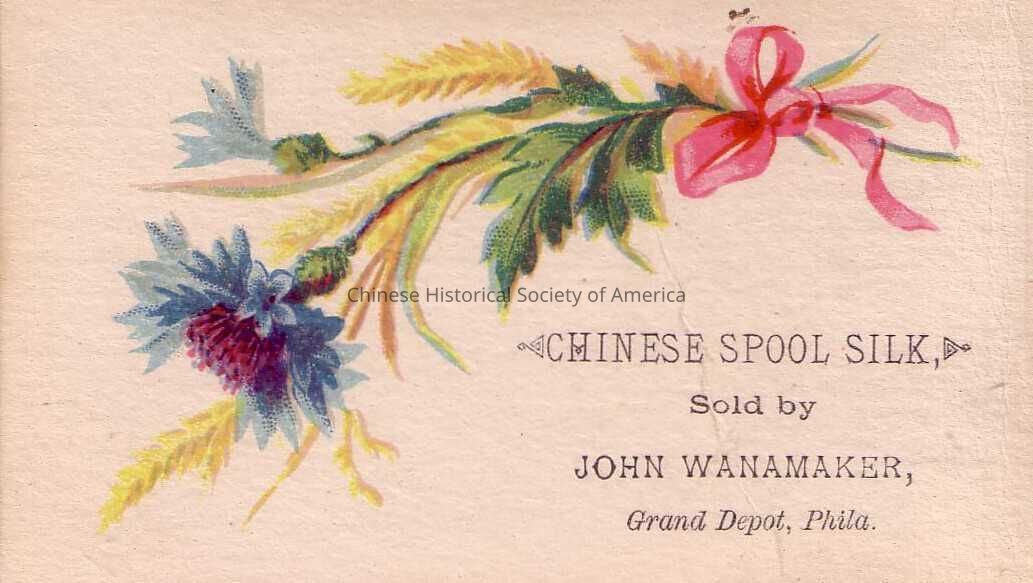 Front: Illustrated on this card is a bundle of two blue flowers and yellow ferns tied together with a pink ribbon. Written on the tradecard is the following: Chinese Spool Silk-Sold by John Wanamaker, Grand Depot, Phila